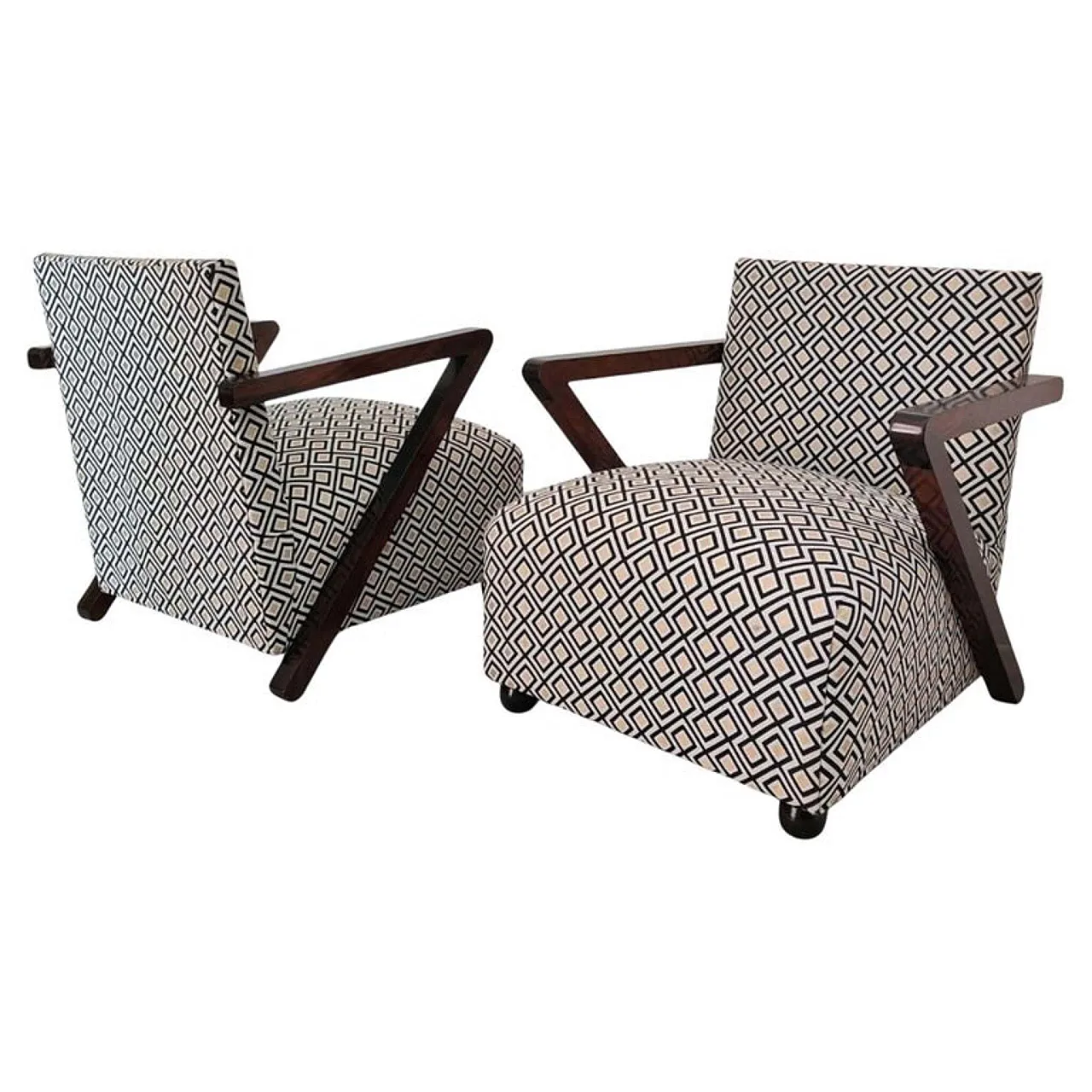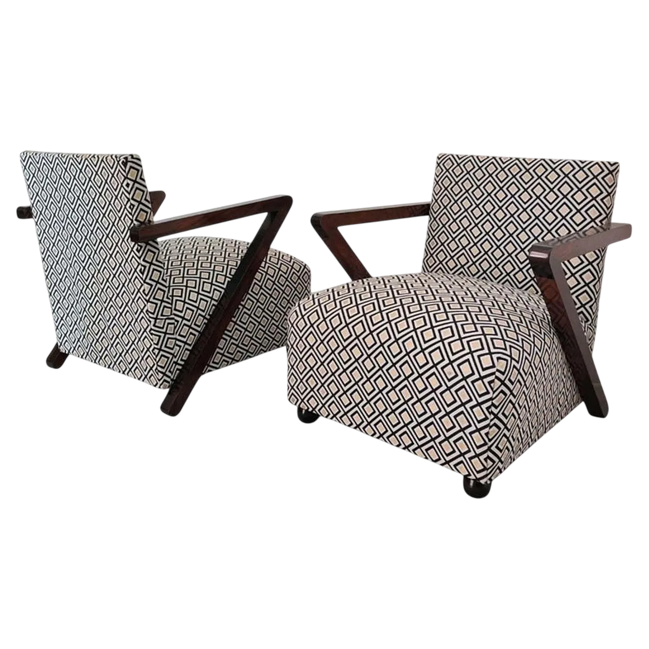 Recently restored with meticulous care, these armchairs have been covered and padded using the original springs of the 1930s, preserving their historical integrity. The new coating has a refined fabric with white and black rhombuses, which emphasizes the timeless charm and the graphic clarity of the aesthetic Art Déco.