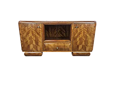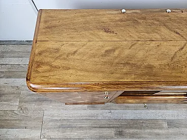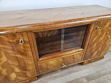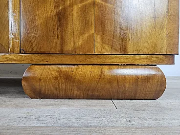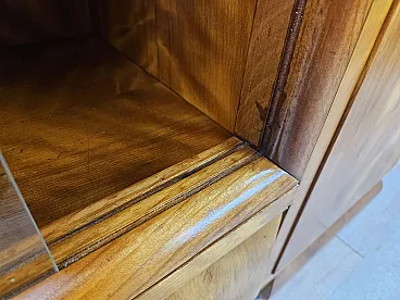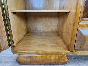 Elegant 1940s toilet covered in blond walnut root with double side door and internal shelves. At the center there is an original sliding glass of the time with compartment and a large and solid drawer at the base. Very particular and contained in the measurements, which is ideal as an entrance furniture empties pockets or in the bedroom or living room. It has normal signs due from age and use, the knobs are new. Polished with oil and shellac.