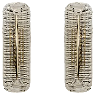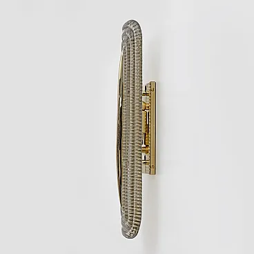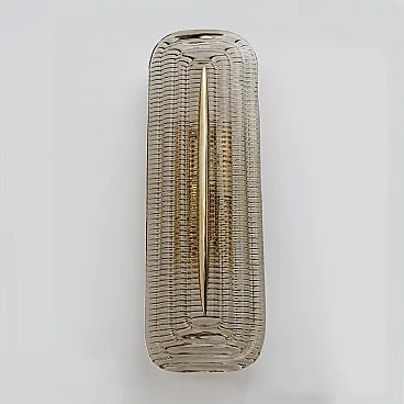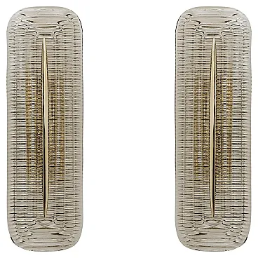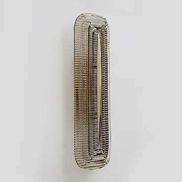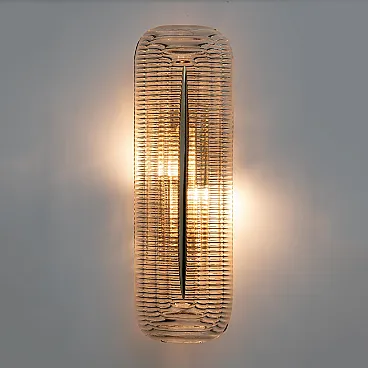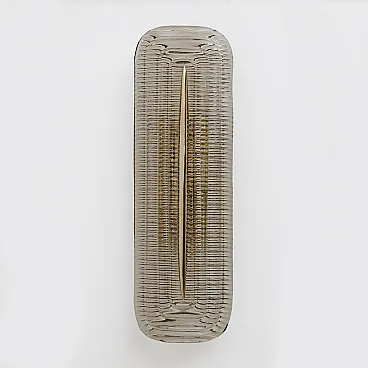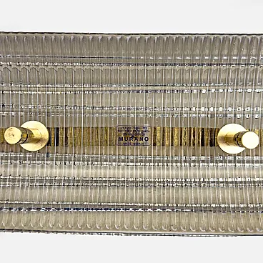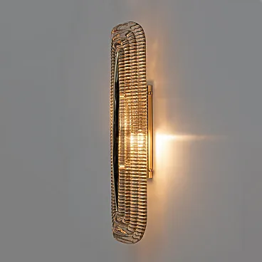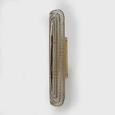Beautiful lamps in Murano glass and brass, structured glass, made even more beautiful by the polished brass base. The wall lamps are composed of a brass structure that is fixed to the wall with dowels and a large sheet of smoked Murano glass that fits into the appropriate seat. The door has a very thick glass structure; blown and pressed glass to obtain the material effect of fine fabrics, structured effect. Note the accuracy and precision with which they have been finished. Refinement and class as in the Murano style, unique pieces that always remain precious. When turned on, the wall lamp is very bright: thanks to two G9 bulbs, it will perfectly illuminate your home. The fixing plate measures cm: H17xW6. Various pairs available, also in other larger or smaller sizes