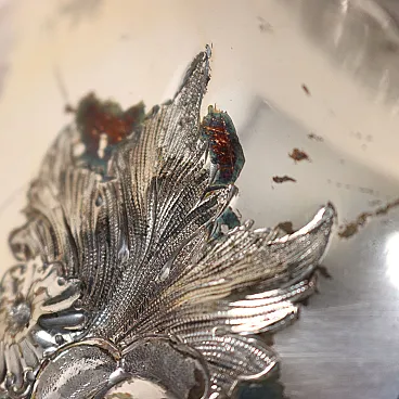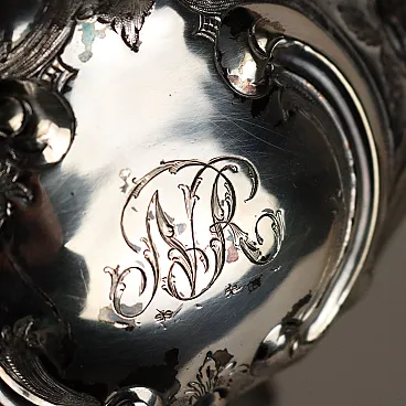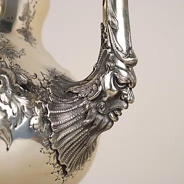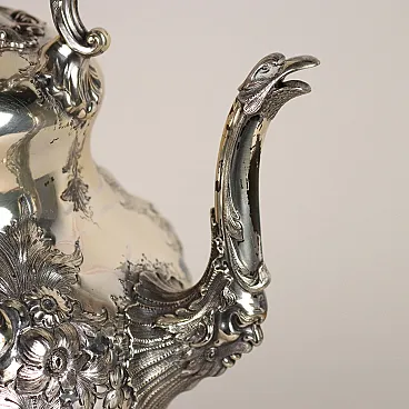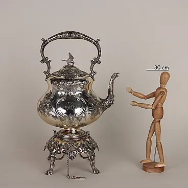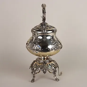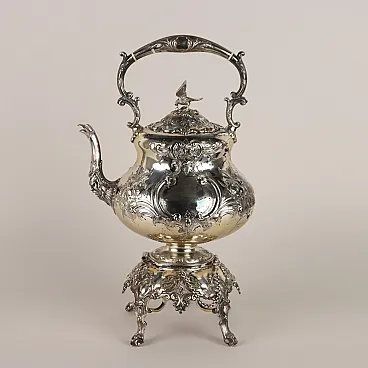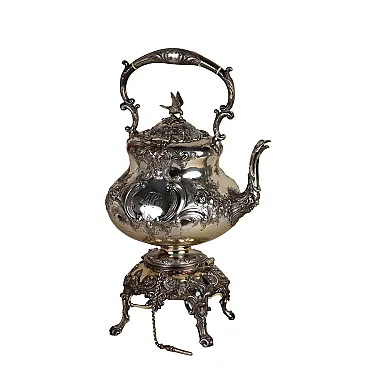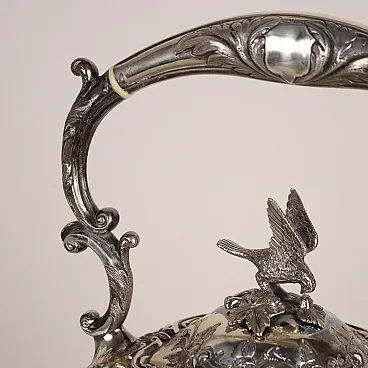 Kettle in silver-plated metal, embossed and engraved with leafy scrolls and flowers. Handle depicting a bird of prey, handle with bone inserts and spout with a relief mask and bird\'s head. Working tilting mechanism. Manufacturer\'s marks engraved under the base.