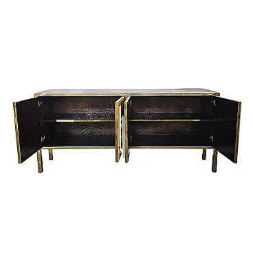 Four -door sideboard, entirely handmade, with wooden structure and covered in colored glass; Enriched with brass -shaped handles in brass, profiles and golden feet. Dimensions (LXPXH) 200 x 45 x 92 cm