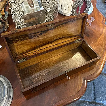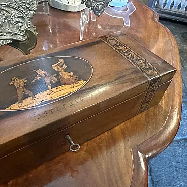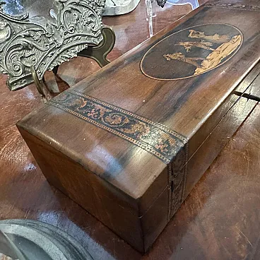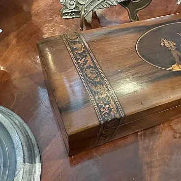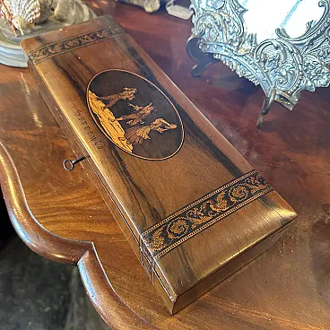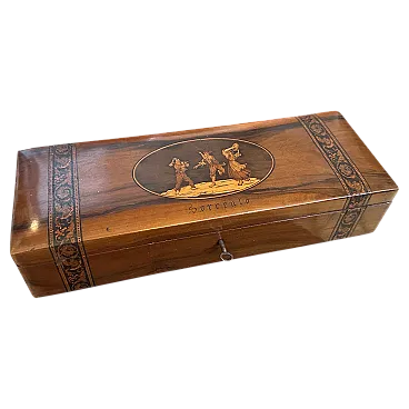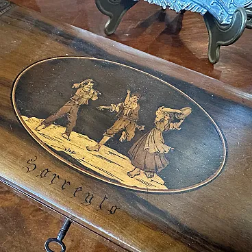 This is a beautifully crafted antique Italian wooden box named after the town of Sorrento in southern Italy, which is famous for its intricate marquetry and inlay work. Polished walnut wood, commonly used in Italian marquetry. The top of the box features a central inlaid design showing three traditional Italian figures dancing. This style of inlay, made with different types and shades of wood, is a hallmark of Sorrento craftsmanship. The word "Sorrento" is inlaid or carved beneath the central design, marking its place of origin. The box is bordered on the sides and ends. Such boxes were popular souvenirs in the 19th and early 20th centuries, often purchased by travelers on the Grand Tour. Today, they are collected for their fine craftsmanship and historical charm. The box is in very good condition overall considering use and age.