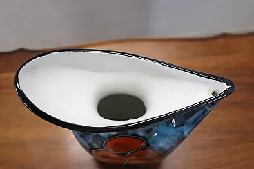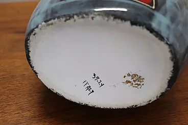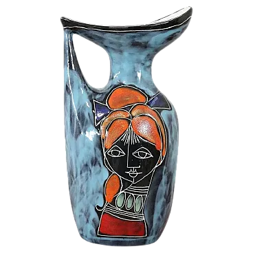 Here is a splendid Italian carafe vase of the 60s, with a unique and futuristic design that will surely catch the attention of anyone who looks at it. Made of high quality ceramic, this vase has an exquisite nail polish decoration in vibrant shades of blue, completed by an accepting abstract representation of a cheeky girl with surprising orange hair, on both sides of the pot.