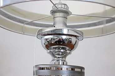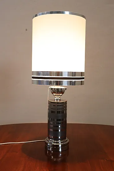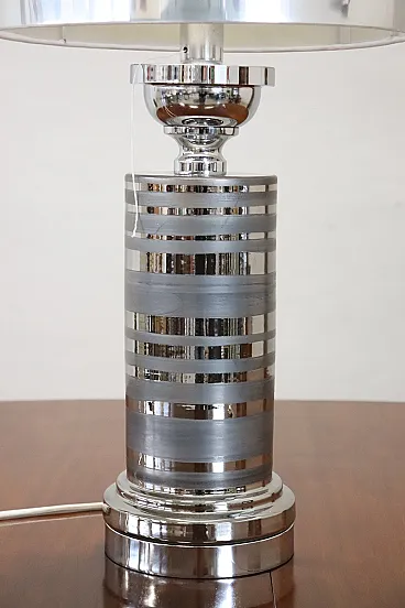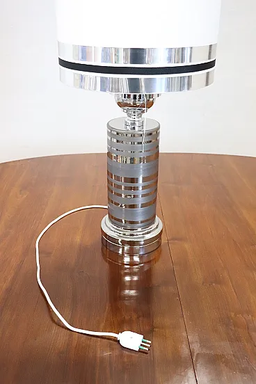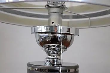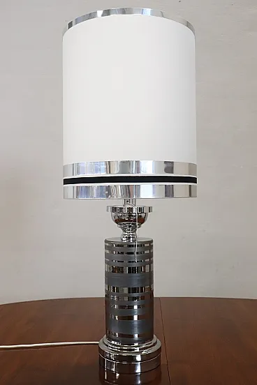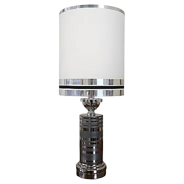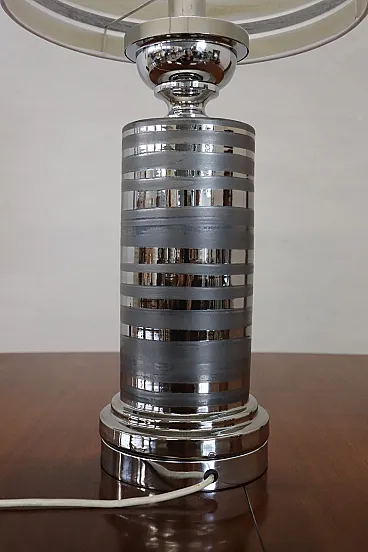 We present a splendid Italian vintage table lamp, built in the seventies. This exquisite piece features a ceramic body adorned with an elegant silver -colored nail polish, perfectly combined with an elegant chromed metal base and a high terminal section in chromed metal. The high lamp lamp, made of fabric and enriched with chromed bands, perfectly completes the overall design.