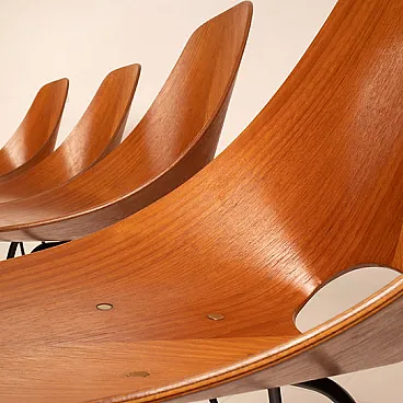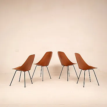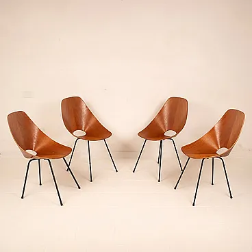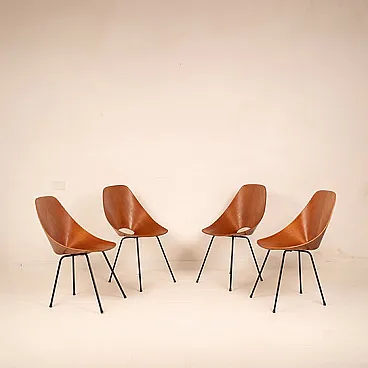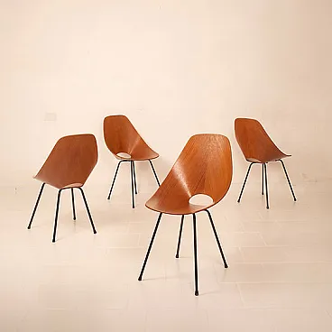Gorgeous set of 4 Medea chairs by Vittorio Nobili, an icon of Italian design from the 1950s. Designed in 1955 and produced by the historic Tagliabue company, these chairs embody the elegance and innovation that characterized the post -war design. Their peculiarity lies in the refined processing of curved wood, a technique that allows to obtain harmonious and light shapes, while enhancing the resistance of the material. Made of beech plywood with a precious packed in mahogany, the Medea have a monocoque session with sinuous and welcoming lines. A distinctive detail is central drilling, not only an aesthetic, but also functional element, since it contributes to the flexibility of the structure and the comfort of the user. The base consists of thin legs in black lacquered metal, which give a light and elegant appearance while guaranteeing stability and robustness. The style of the Medea chair fits perfectly into the context of modern mid-century, a movement that has revolutionized the furniture of the time with its essential and innovative approach. The combination of the heat of the wood and the lightness of the metal structure creates a perfect aesthetic balance, making these chairs ideal for sophisticated and timeless environments. This attention to detail and functionality was recognized in 1956 with the assignment of the prestigious Compasso d'Oro Prize, one of the most important awards in the world of design. Even today, the Medea are highly sought after by collectors and vintage furnishings enthusiasts and recently returned to production re -reiterated by the home studio. Their craftsmanship and timeless elegance make them pieces of great value, both for those who want to enrich their home with an iconic design object, and for those who consider them a real investment. Their timeless charm makes them perfect for different contexts, from the residential interiors to the most exclusive environments, confirming their role as a masterpiece of Italian design. The chairs are presented in excellent general condition with some small sign of the time as per photographs given their more than 70 years.