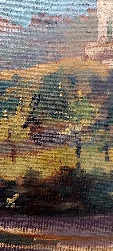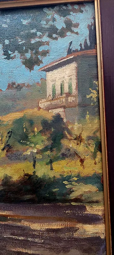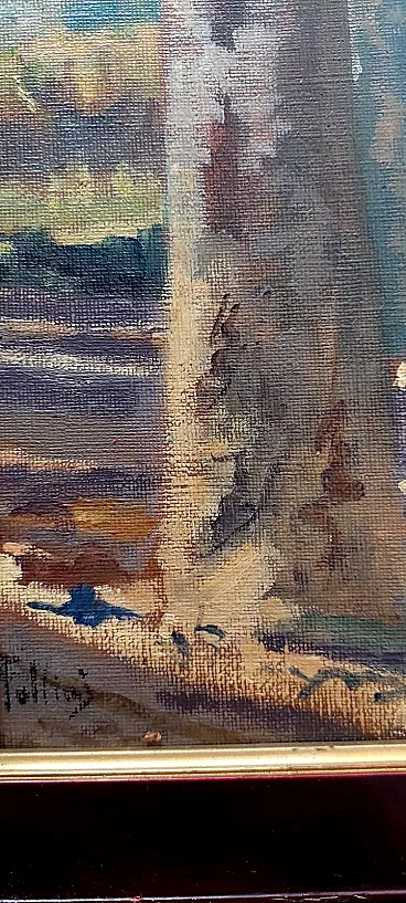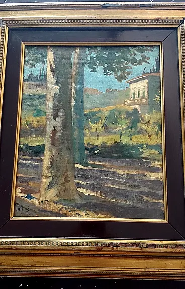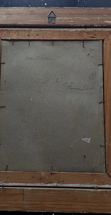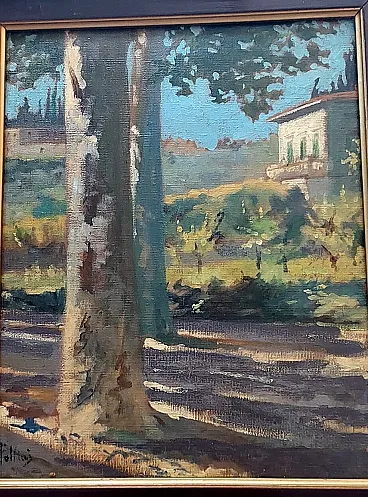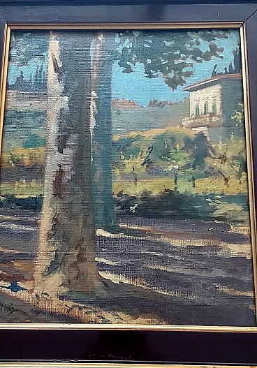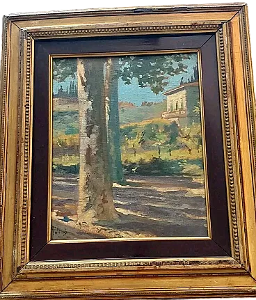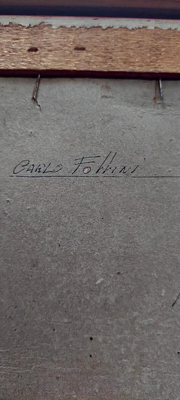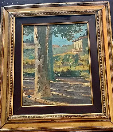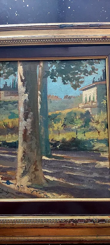 Beautiful work of the famous Ligurian painter Carlo Follini- Technique Oil on Telato Cardboard inserted in an antiqued frame on the left at the bottom of the back be written by Carlo Follini and prof. (It seems) Salviati Mis. Opera 31x25 frame 48x42 cm. . Carlo Follini (1848-Pigli 1938) Carlo Follini studies mathematics while he is used at an insurance, at the same time he devoted himself to self-taught painting. He then enrolled in 1873 at the Albertina Academy of Turin, to follow the landscape courses held by Antonio Fontanesi and since that year he participated continuously in the promoter of Turin. Design. In the same year, inspired by Fontanesi, his production begins with "Fishermen's cottage" and "a corner of my garden" which exhibits at the Turin promoter company, enjoying a good consent of the public and critics. Dating his studies, Follini is repeatedly rewarded for his artistic production. In 1877 he moved to Bologna accompanied by his brother and in the following years, he undertakes several journeys in important Italian cities. Naples, where he exhibits "sunset" to the Promoter Salvator Rosa. In 1881 he returns to Turin, while continuing over the years his travels in Italy and Europe, during which he makes studies from the true, completed later with the use of different techniques and issues: from the Marine (Fosco sunset in Viareggio, 1902, Turin, civic gallery of modern art); to the lake and lagoon landscapes; to the alpine views (Sandeveraggio on the Alps, Rome National Gallery of Modern Art); At the Nature Death (Morta Nature, Turin, Civic Gallery of Modern Art). In 1883, there is a figure at the exhibition of the Promoter of Fine Arts of Genoa, where it will continue to be present in the years to come, also on the occasion of the exhibitions of the promoter company "Alere Flammam" .Nel 1892, the year in which he is appointed honorary partner of the Albertina Academy of Turin, is among the founders of the "Acquarellist society and Pastellists ", then" Society of Friends of Art " Lombardi. Assiduous visitor to the Ligurian Riviera, to whom a large part of his artistic production is dedicated, he will establish himself until his death, which took place in Pegli (GE) on March 6, 1938.