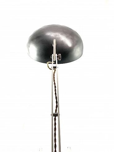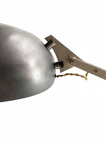 enameled steel and aluminum, spun aluminum, chrome-plated steel.Dark grey aluminum shade with a white aluminum diffuser which is adjustable. Heavy enameled steel frame bolted together with metal bolts end chrome-plated blocks. Enameled aluminum, aluminum, enameled steel, chrome plated steel, plastic. Conditions good all original condition, consistent with age and use. No dints in shade. Perfectly functioning.