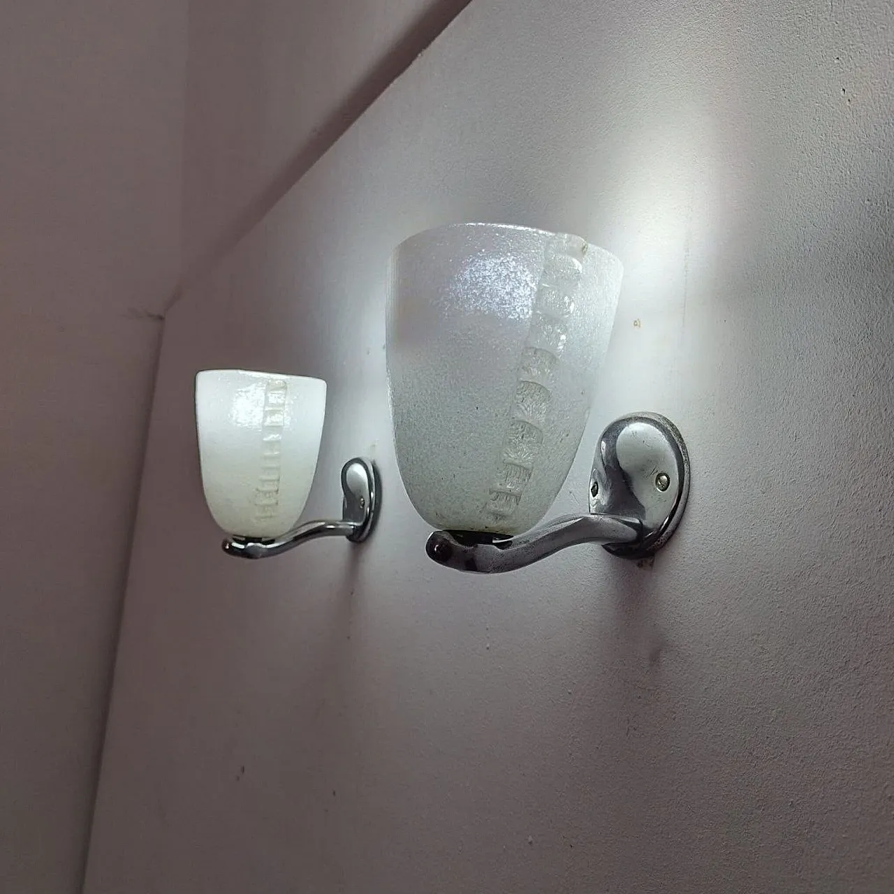Elegant pair of art déco -style applique designed by Carlo Scarpa for Venini in the early 1930s, a perfect example of balance between material experimentation and formal purity. Each applique consists of a blended murano glass lampshade with transparent and lactiginous finish, which spreads light in a soft and atmospheric way. The chromed metal frame underlines the rationalist taste of the time, giving brilliance and a modern touch to the composition. The compact and geometric proportions make these lamps perfect for entrances, corridors, living rooms or vintage and rational -style environments. A rare example of Italian historical lighting, signed by one of the greatest masters of twentieth century design. Dimensions: Height: 15 cm Width: 15 cm Depth: 14 cm Conditions: Excellent vintage condition, with very slight signs consistent with age.