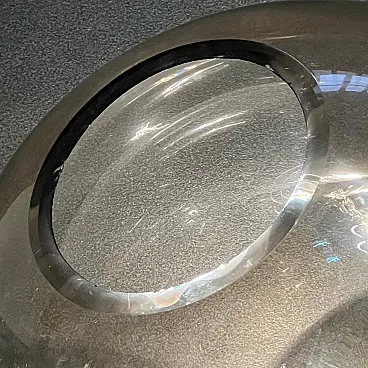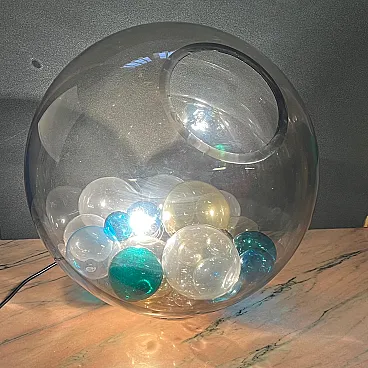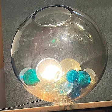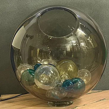 This extraordinary table lamp, model Pallotta, is a rare example of the excellent craftsmanship of Venini, a famous Murano-based manufacturer. Made in the 1960s, the lamp features a large globe of transparent smoked blown glass, inside of which are glass spheres of different sizes in shades of blue and white, which diffuse light with an evocative and ethereal effect. The minimalist elegance of the design, combined with the technical mastery of glassmaking, makes this lamp not only a fine piece of furniture, but also a collector's item for 20th-century lighting enthusiasts. It should be noted that the edge of the mouthpiece has small chipping, signs of normal wear compatible with the age of the object. The Pallotta lamp was designed by Paolo Venini and Massimo Pistilli, two key figures in the Italian design scene. Venini: Tradition and Innovation in Murano Glass Founded in 1921 by Paolo Venini, the Venini company is synonymous with excellence in art glass making. By collaborating with some of the greatest master glassmakers and designers of the 20th century, Venini has been able to blend tradition and innovation, creating timeless works that continue to fascinate collectors and enthusiasts around the world. This *Pallotta* lamp perfectly embodies the spirit of Venini: a fusion of artistic experimentation and craftsmanship that makes it a unique and precious work of art.