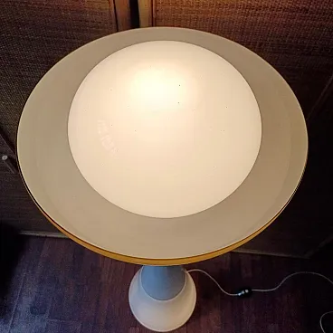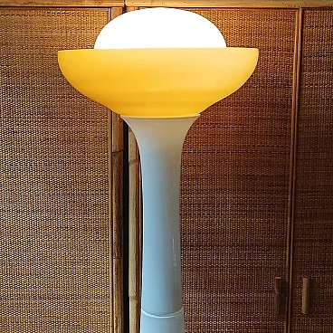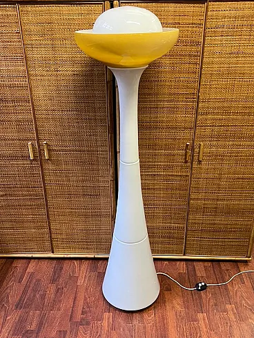 An elegant testament to the Italian avant-garde design of the 1960s, this rare floor lamp is a masterpiece signed by Carlo Nason for the Selenova manufactory, famous for its collaborations with Murano's finest glass masters. The entire body develops with a plastic balance of great scenic impact: the stem, articulated in three modular sections of white opaline glass, rises with sober monumentality, acting as a luminous column that diffuses a soft and uniform light. The choice of milky white glass is not accidental: in addition to ensuring an even spread, it recalls the minimalist and experimental aesthetic that characterized Nason's work at the time. A wide blown Murano glass bowl, a warm, sunny yellow, is grafted onto the top, introducing a powerful chromatic element, enhancing the transparency and textural depth typical of Venetian craftsmanship. This cup, in addition to its optical and decorative function, houses within it an element of rare originality: an irregularly shaped, almost organic white bowl that seems to float in the golden transparency of the surrounding glass. This interplay of volumes, shapes, and colors creates a dynamic and sophisticated lighting effect that makes each lighting a small play. Striking a perfect balance between art and functionality, this lamp is not just a light fixture, but a true light sculpture, a testament to Carlo Nason's experimental approach and the extraordinary technical skill of the Murano masters. Its scenic presence makes it ideal for sophisticated settings where you want to combine light, art and historic Italian design. Rare and sought-after piece, preserved in excellent original condition. Carlo Nason (Murano, 1935)u2028Descended from a historic Murano family active in glassmaking since the 18th century, Carlo Nason stands out in the Italian design scene for his visionary style and constant striving for formal and technical experimentation. After training in direct contact with the island's master glassmakers, he developed an independent career working with prestigious manufactures such as A.V. Mazzega and Selenova. His work lies at the crossroads of art and industrial design, and is characterized by innovative use of blown glass, elegant volumes, and an almost sculptural sensibility in the conception of luminous objects. His creations are now part of important museum and private collections, appreciated internationally. Selenovau2028Founded in the 1960s, Selenova represents one of the most interesting brands in Italian post-World War II lighting. Specializing in the production of Murano glass lamps, the company stands out for the high quality of its materials and its ability to combine craftsmanship and signature design. In the years of his greatest activity, Selenova collaborated with some of the most innovative names on the Italian scene, including Carlo Nason, making unique and limited edition pieces that are now sought after on the collectors' market for their aesthetic and historical value.
