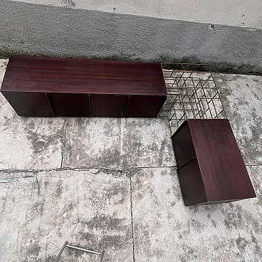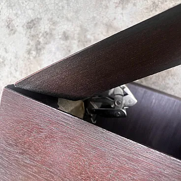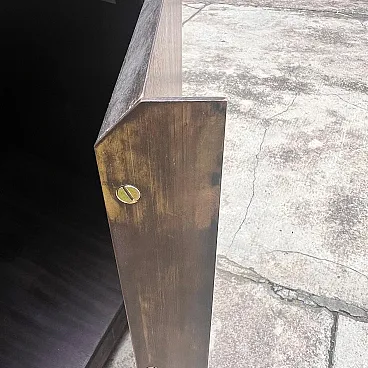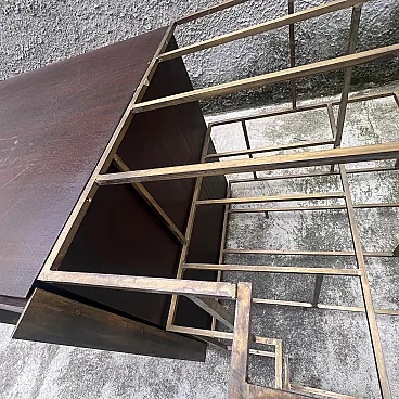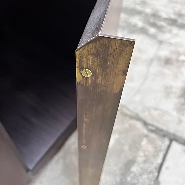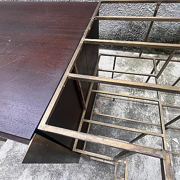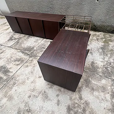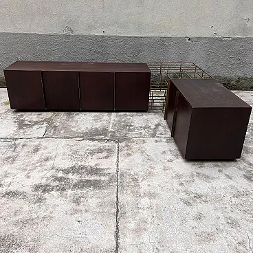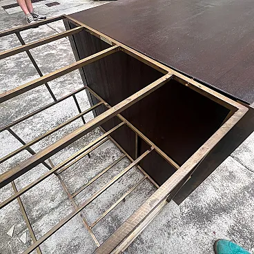 The sculptural sideboard model "Train" represents a unique masterpiece, the result of Alberto Tonni's craftsmanship and artistic vision in the 1980s. Made entirely of richly grained fine woods, this functional work of art is embellished with brass plate handles, which add a touch of elegance and sophistication. The structure of the sideboard is composed of three distinct elements that, when combined, form a visually striking corner piece of furniture. The first element is a linear section equipped with four doors, providing ample space for storing items and keeping the room tidy. The second element is a unique decorative part: a kind of angular cage made of thin brass rods, which gives lightness and dynamism to the whole composition. The third element is an additional storage cabinet with doors accessible from both sides, designed to provide functionality and versatility in daily use. Attention to detail and the harmonious combination of fine materials make the "Train" sideboard not only a piece of furniture, but a true sculpture capable of enhancing any living space with its distinctive presence. Alberto Tonni is an entrepreneur, collector and design enthusiast with a career spanning several decades. His passion for furniture and design emerged in the 1980s, when he began to focus on creating unique furniture and objets d'art, often handcrafted using salvaged materials and traditional craft techniques. Tonni is known for his ability to transform anonymous pieces into functional works of art, combining vintage aesthetics with a contemporary twist. In addition to furniture production, he has collaborated with various craftsmen and designers, contributing to interior design projects and participating in exhibitions and displays in the field. His attention to detail and dedication to quality craftsmanship have solidified his reputation as a talented designer in the Italian design scene. Design and fabrication of the sculptural sideboard model "Train" in rosewood and brass. Creation of the "Café" series in the 1990s, including small tables in burnished natural iron and brass, featuring organic and asymmetrical designs. Collaboration with artisans to create custom furniture, integrating vintage and contemporary design elements. Participation in interior design projects, contributing unique pieces that reflect his artistic vision and skill in the use of fine materials. Alberto Tonni's career continues to inspire design enthusiasts and collectors, thanks to his ability to combine functionality and aesthetics in timeless creations.