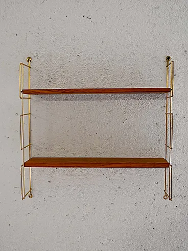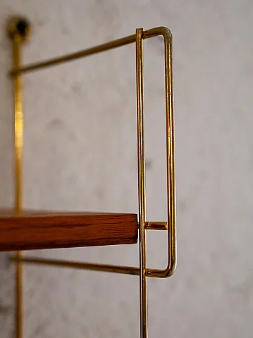 Elegant Scandinavian -style wall shelf with thin brass structure and two teak shelves. The combination of materials creates a refined contrast between the heat of the wood and the brightness of the metal. Essential and light lines enhance the functional and decorative design. Perfect for vintage or modern style environments.