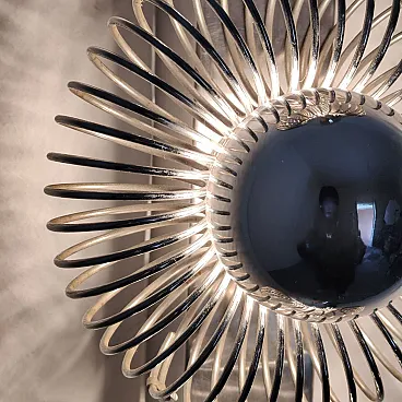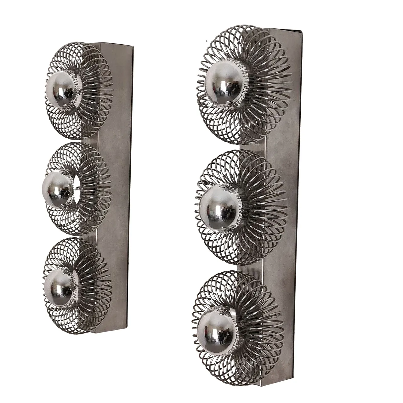 Rare pair of Applique by Philippe Rogier for Oxar, France, 70s A rare and suggestive pair of vintage applique designed by Philippe Rogier for Oxar, France, around the 70s. These sculptural lamps embody the essence of the French avant -garde lighting design of the time, combining functional innovation and artistic presence. Each applique has a minimalist metal base, from which three concentric spiral elements extend, fixed by mirror reflector bulbs. When illuminated, these spirals project a dynamic and suggestive luminous motif on the wall, creating a hypnotic play of lights and shadows. Design is as as kinetic art as lighting, with a strong sculptural impact both from heated and off. The lamps are mounted on the wall with two discrete screws and include the original reflector bulbs, essential to obtain the distinctive bright effect. A real collector's piece, perfect for modern, futuristic or brutalist interiors, ideal for adding a touch of French design history to any environment. Conditions: Excellent vintage conditions with light patina.