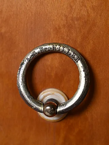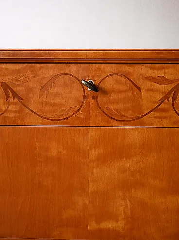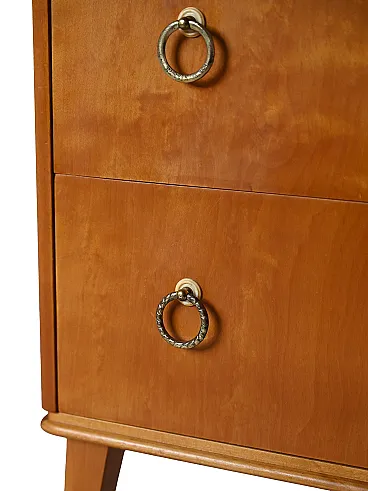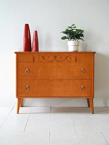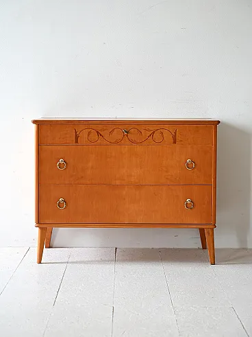Vintage chest of drawers with three drawers in light oak with decorative inlay and brass details, late 1940s. Elegant Scandinavian drawer in oak and root dating back to the late 1940s, with floral inlay on the upper drawer. The three drawers offer ample space, while the brass ring knobs add a refined touch. The tapered legs slept the structure, maintaining a balance between functionality and decoration. Good condition. It may present signs of time. Pleasure pay attention to the photographs.