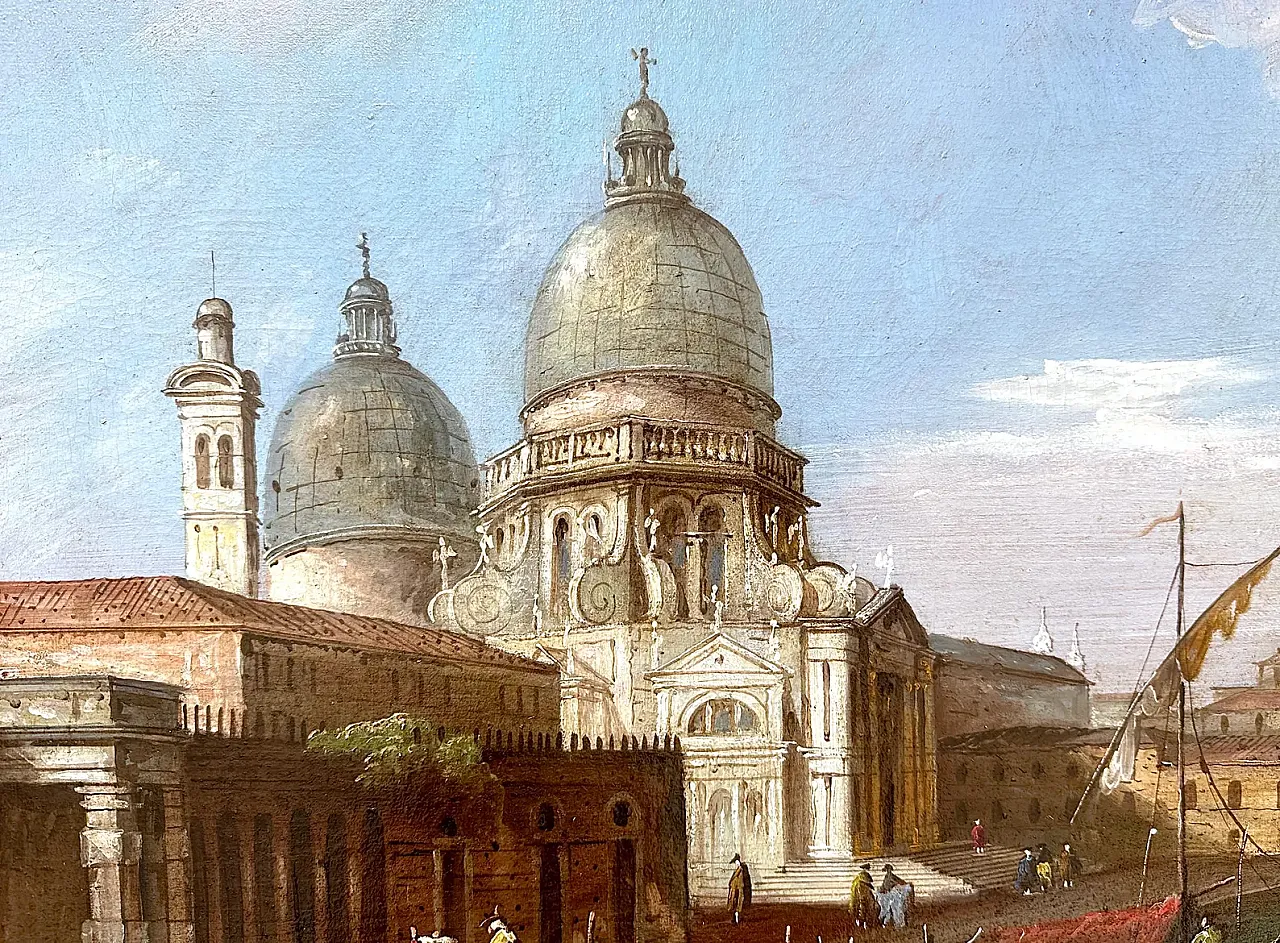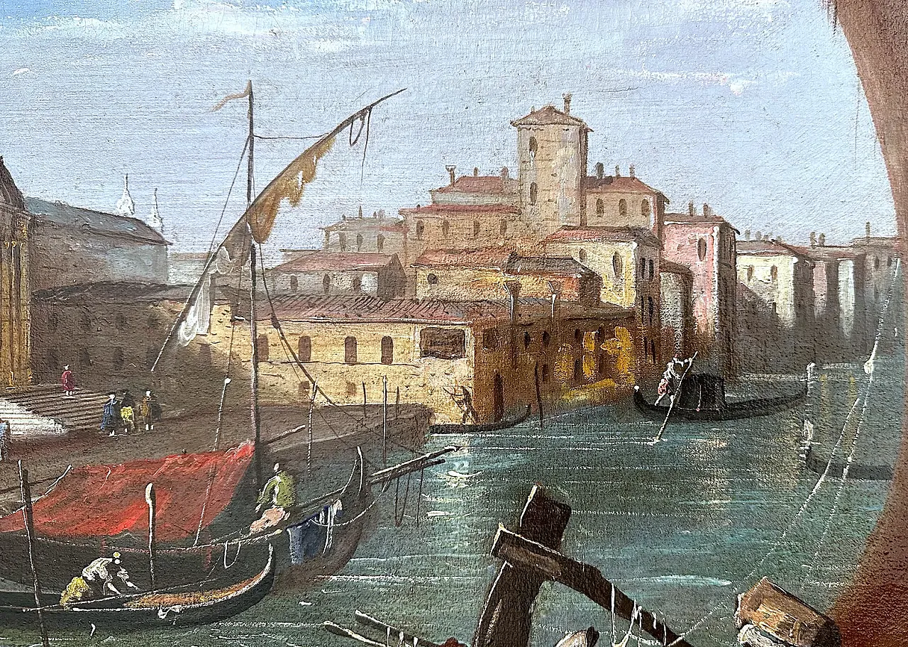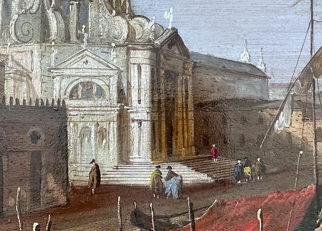 The extraordinary pictorial quality, evident both in the drafting of architecture and in the realization of the figures and boats, immediately brings us back to the famous Venetian seer Michele Marieschi (Venice 1710 - 1743)