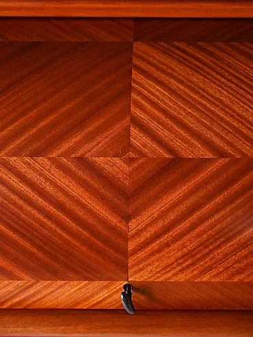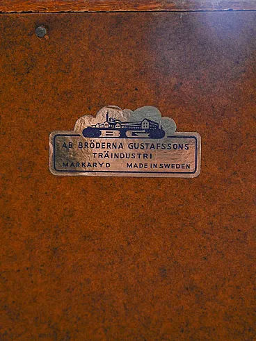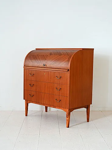 Secretaire in Mogania, three drawers and hidden desk. Elegant roller closure with fishing vein. Elegant Swedish secretaire of the 1950s attributed to AB Bröderna Gustafsson, complete with original label. The mahogany structure has a beautiful thorn processing on the roller, which conceals an internal desk with small rooms and drawers. Three lower drawers with brass handles complete the volume. Good condition. It may present signs of time. Pleasure pay attention to the photographs.