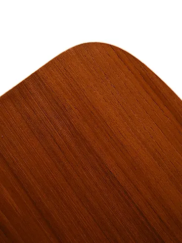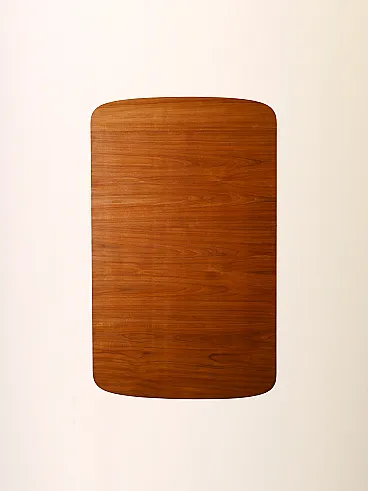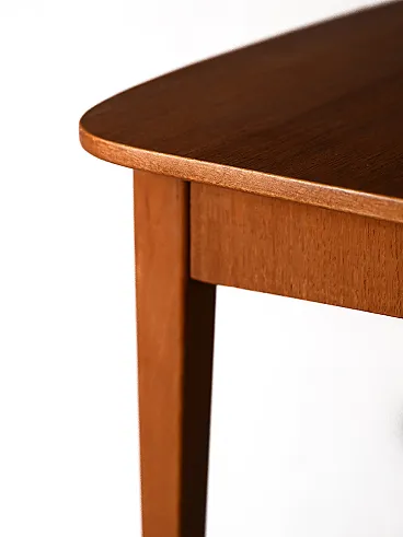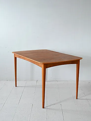 Teak dining table with a central 50 cm raising. Soft lines and balanced proportions. Scandinavian teak dining table, datable to the 1950s/1960s, characterized by rounded shapes and light structure. The rectangular surface is equipped with a central 50 cm raising, integrated with discretion. The tapered legs and the toned edge tell a careful and consistent process with the Nordic design of the time. Good condition. It may present signs of time. Pleasure pay attention to the photographs. Closed table length: 130 cm Open table length: 180 cm
