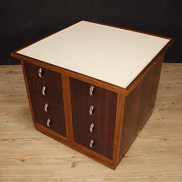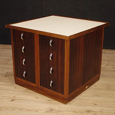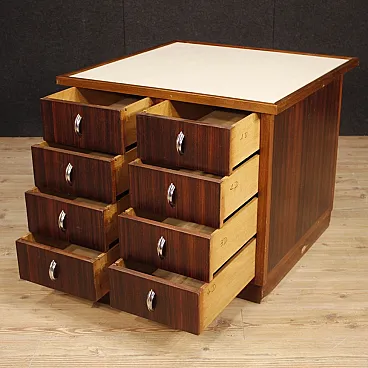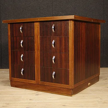 French chest of drawers of the twentieth century. Mobile of particular shape and construction in mahogany woods, rosewood and beech adorned with chromed metal handles. Drawer finished by the center, equipped with 8 front drawers with excellent capacity and service. Upper floor in fake skin with some small sign of wear (see photo). Design furniture of pleasant furniture. It has a sign in the back (see photo), a drawer overall in good conservative state.