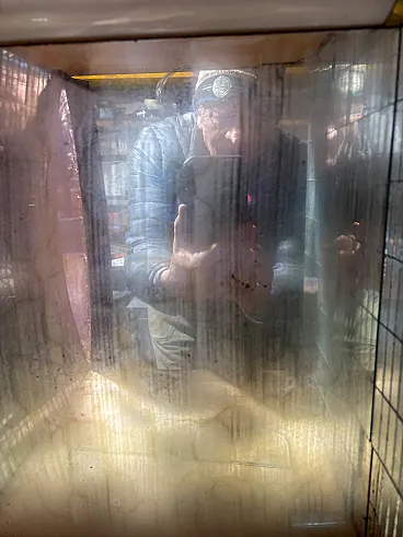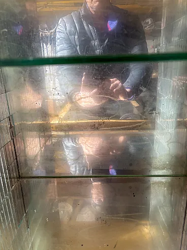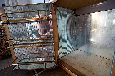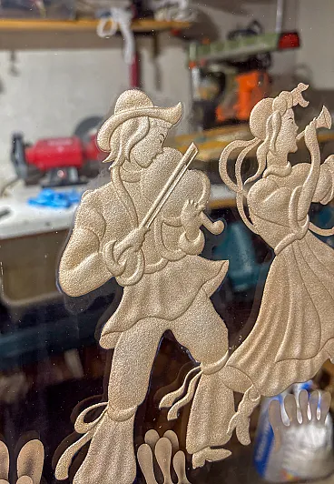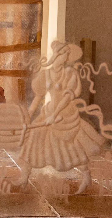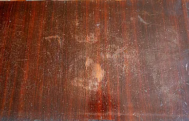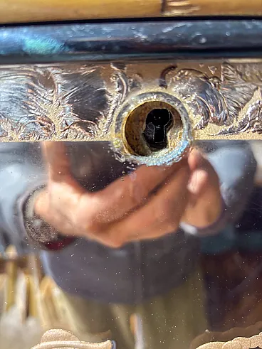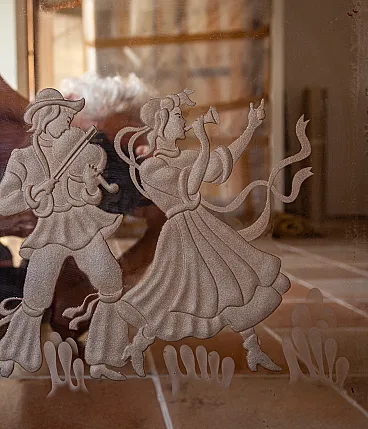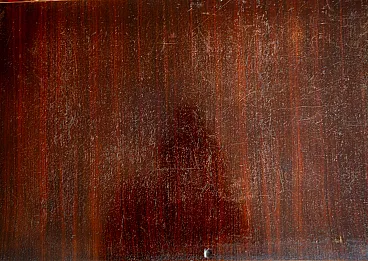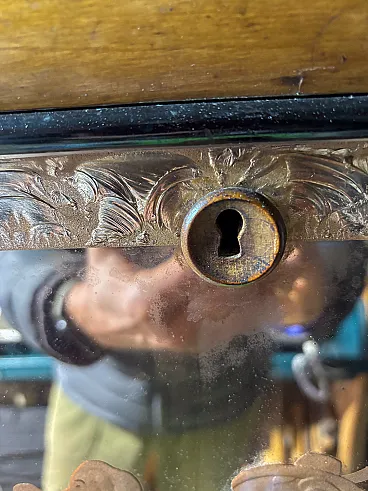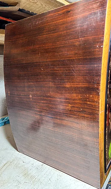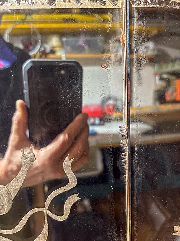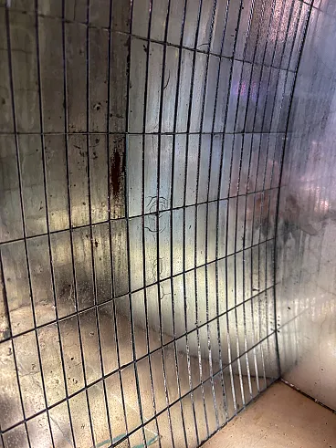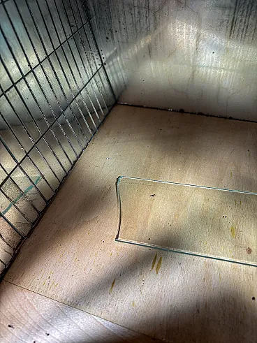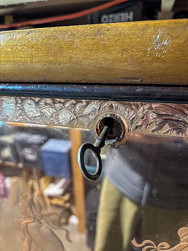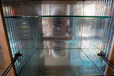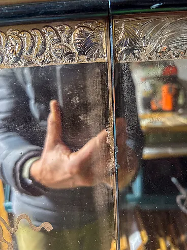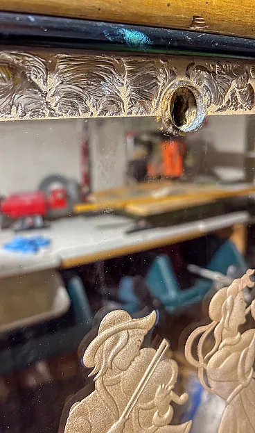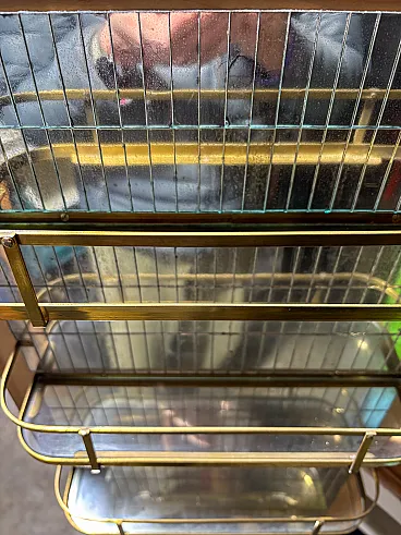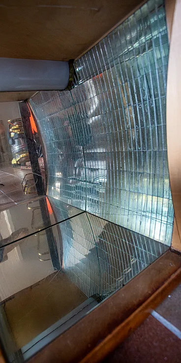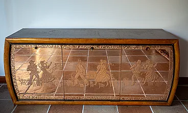 Beautiful belief for Italian manufacturing liqueurs, unknown designer, 1940s. Light wood structure with rounded hips and three front counters, of which the central limelight equipped with key. The furniture is distinguished by the three -sections of three sections in golden glass, mirrored and molated in the Barovier style with motifs of characters celebrating for the harvest season. The interior, also mirrored with glass tiles, is divided into three rooms with transparent glass shelves and brass bottles holder on the two side counters. It is prepared for internal lighting (two electrical cables on the back of the furniture) It requires both internal restoration (numerous glass rectangle (1x4 cm approximately) are detached (collected in an envelope, but it could be missing some). An internal glass shelf is broken. The internal mirror is in dark areas, a key of a limelight/door is missing and the glass edges of a door are mocked. The external wood must be repainted; there are no legs of the cabinet.