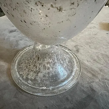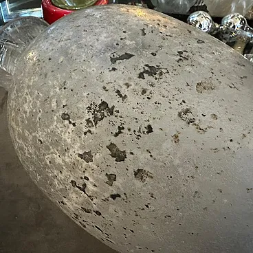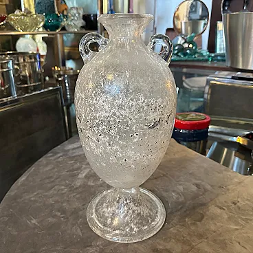 This is a 1970s Scavo Murano Glass Amphora Vase attributed to Seguso, a renowned Murano glassmaking family. The vase exhibits the Scavo (excavated) technique, which gives it an ancient, weathered appearance, resembling archaeological glass artifacts. The Scavo technique , achieved by applying special powders and acids during the glassmaking process to create a corroded, aged effect The color is s emi-transparent with a frosted, mottled texture. Classical shape amphora form with a narrow neck, rounded body, and a pedestal base Handles: Two small, curved, clear-glass handles on either side, adding elegance Inspired by ancient Roman and Greek amphorae, blending historical aesthetics with Murano craftsmanship. Seguso, one of Murano's most prestigious glassmaking dynasties, known for innovation and high-quality glass art. This piece is a highly collectible example of 20th-century Murano glass, perfect for vintage and art glass enthusiasts. It's in very good condition overall, any chips or lines on the glass.