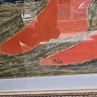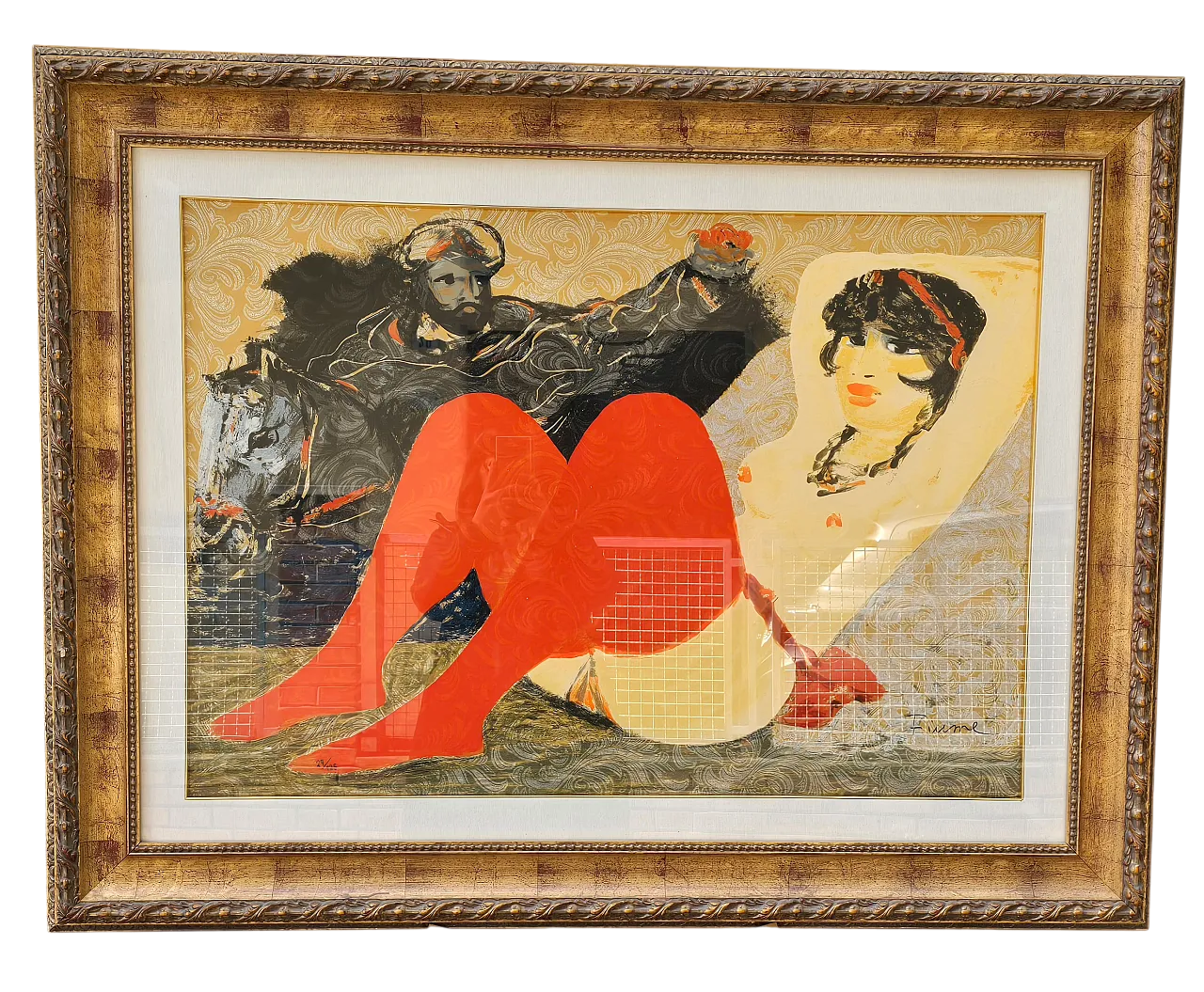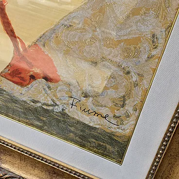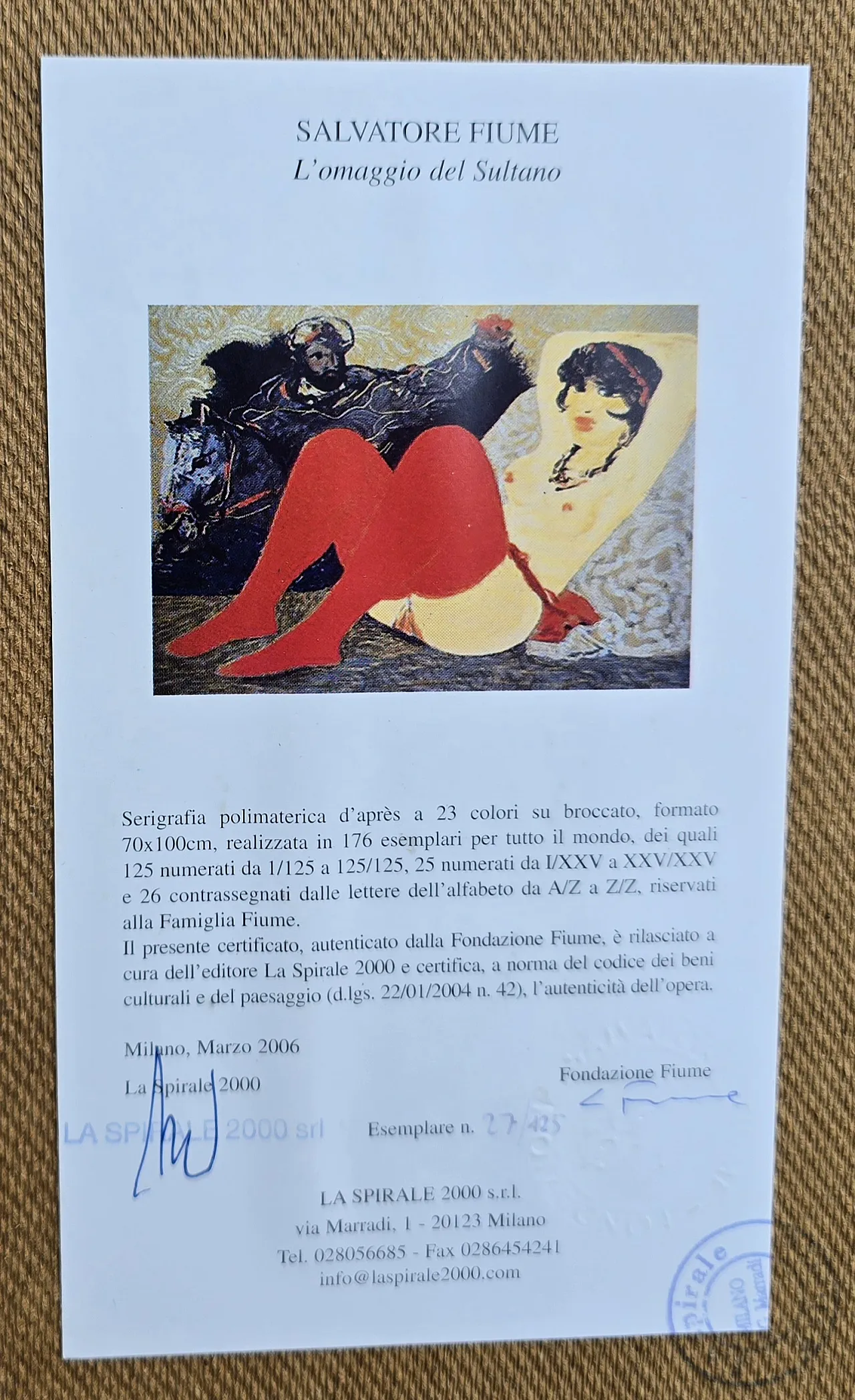 Salvatore Fiume is the tribute of the Sultan Polymoteric serigraphy of the Après with 23 colors on brocade formed70 x 100, made in 176 specimens for the whole world. It is sold with certificate of the Foundation Foundation Biography: born in Comiso, in Sicily in 1915, Salvatore Fiume was a painter, sculptor, architect, writer and scenographer. At sixteen, thanks to a scholarship, he entered the Royal Art Institute of the Book of Urbino where he acquired a profound knowledge of the techniques of the press: lithography, screen printing, etching and woodcut. The beginnings of his painting appear rather contrasted, for an excess, one would say, of temperament and set of technical preparation, which makes him appear a painter of other times, an extremely uncomfortable character. So when in 1946 he reappeared in Milan with two very nourished exhibitions uses the pseudonym and acronym style of a non -existent Andalusian painter, Francisco Queyo, exiled to Paris from Spain in war. His famous "islands of statue" emerge to the attention of criticism in this period and the Venetian Biennale promptly records its birth by hosting a great triptych of river. At the same time a work is purchased by the Museum of Modern Art in New York. Since then, the Personal of Fiume and his participations in collective exhibitions have followed one another with regular frequency, from Milan to Rome, to Florence, Turin, Paris, London, New York, S. Francisco, Moscow, Bonn. Measure with the height 102 depth 131 alternating frame frame 7