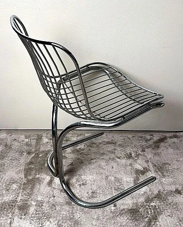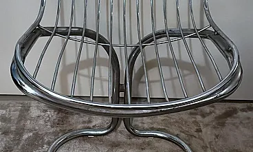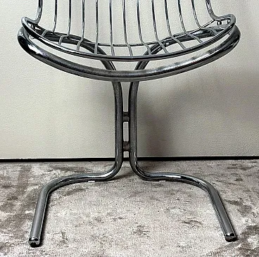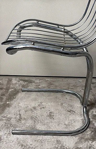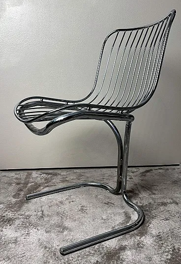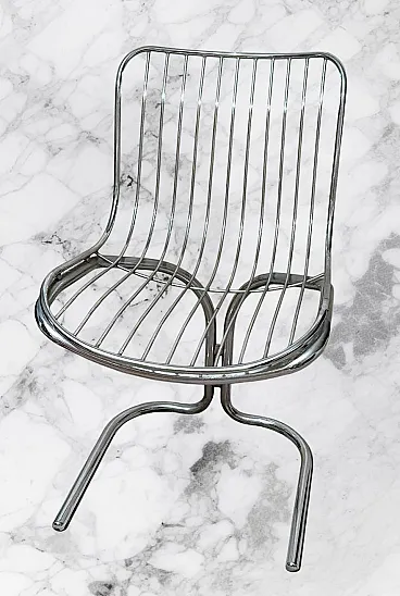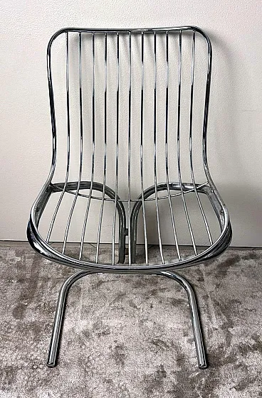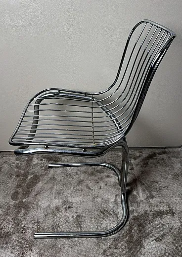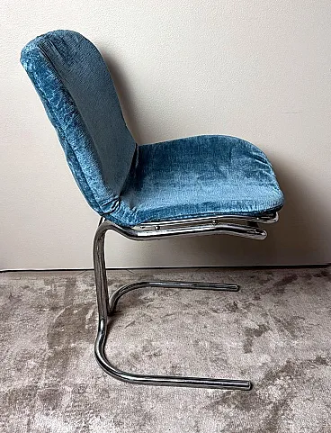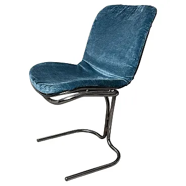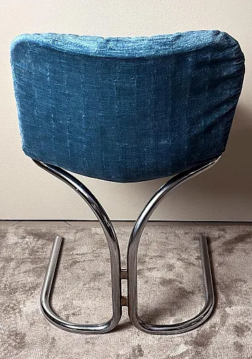 This elegant and iconic Italian chair is crafted from chrome-plated steel tubing, giving it exceptional stability and durability. The padded velvet upholstery covering the seat and backrest in a deep blue hue creates a refined contrast between the softness of the fabric and the sleek lines of the metal frame, offe and st ring a perfect blend of comfort style. Designed by Gastone Rinaldi between 1970 and 1973, this chair was manufactured by Rima in Padua,( Guido Reni street) a company founded in 1916 by Mario Rinaldi, Gastone’s father. Specializing in metal furniture production, under Gastone Rinaldi’s leadership, Rima collaborated with renowned designers and produced some of the most iconic pieces of Italian design. This model, often referred to as “Radiofreccia”, gained its nickname after appearing on the poster for Luciano Ligabue’s film of the same name. However, there is no official confirmation that the company ever formally named the chair this way. Born in Padua (1920-2006), Gastone Rinaldi was a prominent figure in Italian design. After earning a diploma in accounting, he joined Rima, the company founded by his father. Throughout his career, he collaborated with legendary designers such as Giò Ponti, Carlo Mollino, and Marco Zanuso. In 1954, he won the prestigious Compasso d'Oro Award with the DU30 chair, produced by Rima. In 1974, he left the company to establish Thema in Limena, where he continued to receive notable recognitions, including Compasso d'Oro mentions for the Arianna armchair (1978) and the Dafne chair (1981). His Saturno sofa is now part of the MoMA collection in New York. A true innovator in seating design, Rinaldi introduced steel tubing structures and new padding techniques, significantly influencing the post-war Italian design scene. This chair, now considered an icon of Italian design, embodies a timeless aesthetic, where creativity and innovation merge seamlessly. Its clean lines and minimalist silhouette perfectly reflect the modernist style of the era, making it a functional work of art. With harmonious proportions ensuring optimal comfort, the chrome finish enhances its visual appeal by adding brightness and sophistication. The lightweight yet sturdy structure, paired with the elegance of blue velvet, makes this chair a versatile and refined furnishing piece. Ideal for a variety of settings, this chair naturally adapts to both contemporary and classic interiors. Perfect for modern, industrial, or vintage decor, it adds a touch of elegance to a sophisticated dining room, an upscale office, or a stylish living area. Placed next to a glass or dark wood table, it accentuates the beauty of materials, creating a striking visual contrast. Owning this chair means investing in a piece of Italian design history, capable of transforming any space into an exclusive and curated environment. The chair is in good condition, though the chrome finish shows some minor imperfections due to age (see photos). Dimensions: Width: 50 cm (19.7 in).Depth: 45 cm (17.7 in).Height: 85 cm (33.5 in).Seat height: 48 cm (18.9 in)