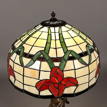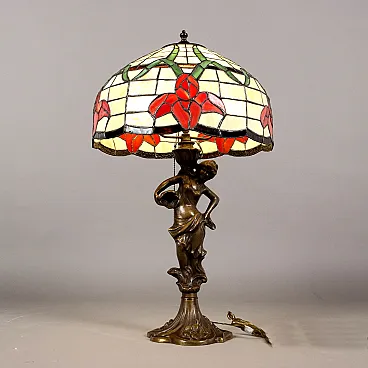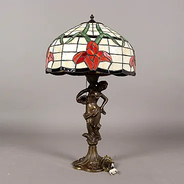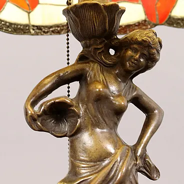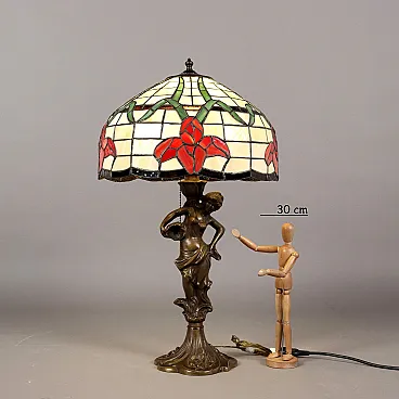 Tiffany style lamp, bronze base with a female figure and leaded polychrome glass lampshade.