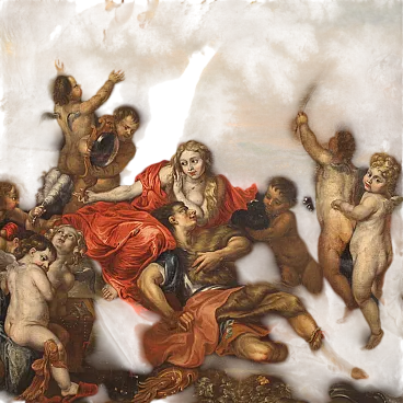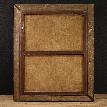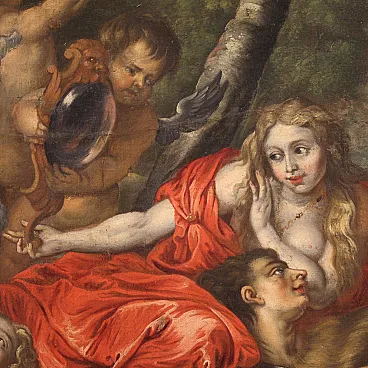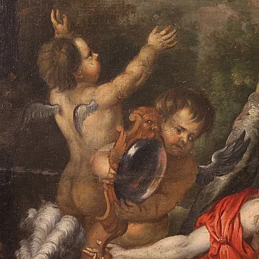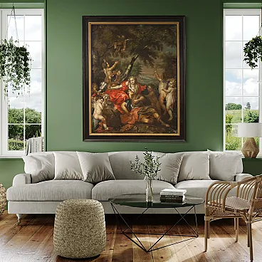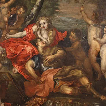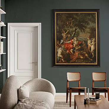 French mythological picture of the second half of the seventeenth century. Oil work on canvas depicting a magnificent allegory of Venus and Mars, of considerable pictorial quality and monumental dimensions. Immersed in a lush landscape we find the protagonists, Venus impersonated by a beautiful girl who looks in the mirror while Mars is deprived of the armor by a whirlwind of Amorini. The richness of the drapery, the abundance of figures and the liveliness of the gestures give dynamism to the composition and accentuate the theatrical dimension of the work. Cake of the 20th century in carved, lacquered and golden wood, with some signs of time. Work already restored with Rintelo, replacement of the frame and color recovery in small points. Overall in good conservative state. Painted light h 153 x l 120 cm.