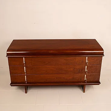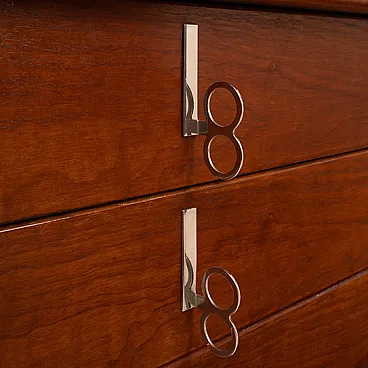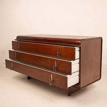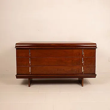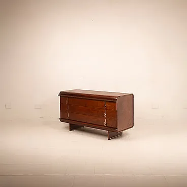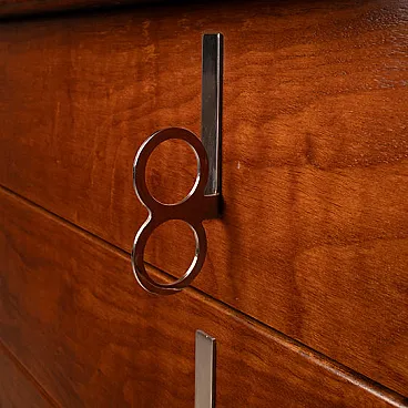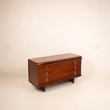 Iconic and rare piece of Italian design, this chest of drawers belonging to the "Pellicano" series represents one of the most sophisticated and recognizable creations of Vittorio Introini, a visionary designer who has been able to combine functionality, experimentation and architectural rigor. Produced by Saporiti Italia around 1960, this chest of drawers perfectly embodies the innovative spirit of Italian modernism of the time. Made of walnut veneered wood with a warm and deep patina, the structure stands out for its sinuous and enveloping profile, with curved corners and chiseled details that betray a very high executive quality. The slightly bombed top and the connected hips give the mobile a sculptural elegance and an unusual visual dynamism for the time. The front is marked by four large and perfectly aligned drawers, embellished with original chromed metal handles, consisting of vertical plates with double ring, which add a graphic and rhythmic note to the composition. The base, backward compared to the main body, gives visual lightness to the entire volume, creating a refined game of full and empty. Balanced proportions, noble materials and a coherent design vision make this furniture not only a functional furnishing complement, but a real work of art. A rare piece in the chest of drawers and currently unique on the market and therefore collectible, perfect for refined environments, author residences or luxury contracts inspired by the mid-centty design. General conditions almost perfect as per photographs although he is more than 60 years old.