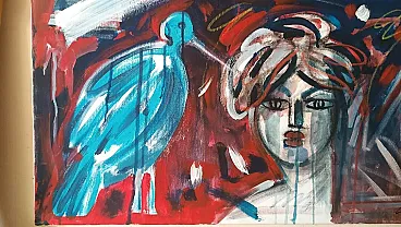 Figurative abstract painting by Dino La Bianca, oil on canvas, late 1900s. Dino La Bianca was born in Viareggio in 1941, he graduated by art at the A. Institute A. Passaglia in Lucca in 1960. In 1962 he attended a scenography course in Rome and carried out works for theater and television. He participates in numerous painting competitions, winning the 1st Absolute Prize, see: Masks and Carnival Viareggio 1958, twice colors of Tirrenia 1961-1962, Castiglioncello Prize 1961, Viareggio Prize 1985. In 1961 the artistic circle "La Gallery of the Fort" founded in Forte dei Marmi, where artists such as Migneco, Carrà, Dazzi and many others who give life to a great life are found "Marguttiana" which follows the famous Roman road a little, where Italian and foreign artists exhibit artists
