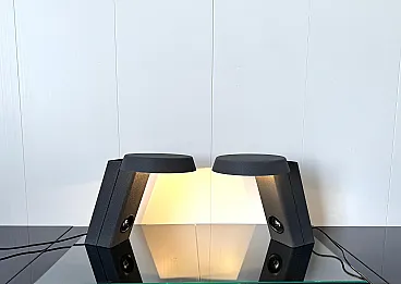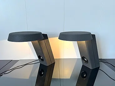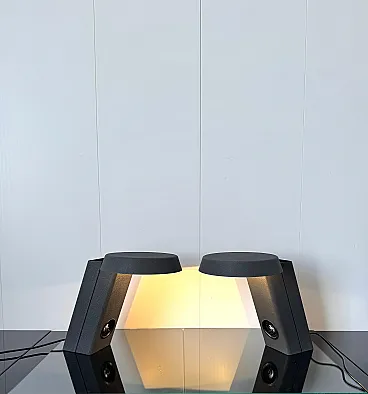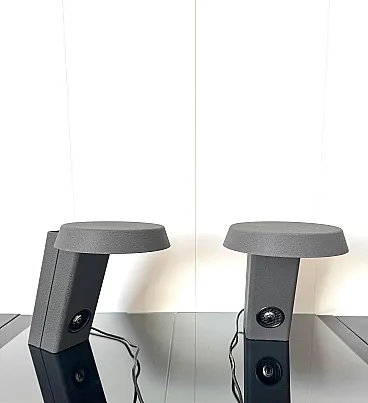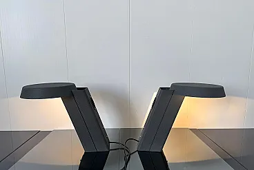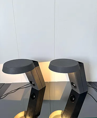 Rare pair of table lamps signed Gino Sarfetti, mod. 607, produced at Arteluce in 1971 Lacquered aluminum frame, Manufacturer's label. The 607 model is a timeless icon of industrial design. At a time when the halogen light bulb was making its first appearance, Sarfatti was inspired to create a light object that could take full advantage of this revolutionary new technology. The design, an expression of ruggedness and masculinity, features a raw aluminum surface that adds a touch of authenticity and industrial chic. Resting on the table without the need for additional supports, the Model 607 lamp is a perfect example of the balance between form and function.