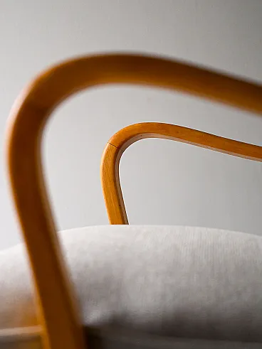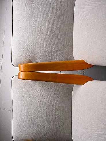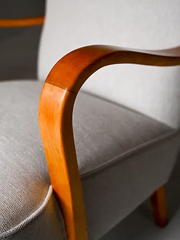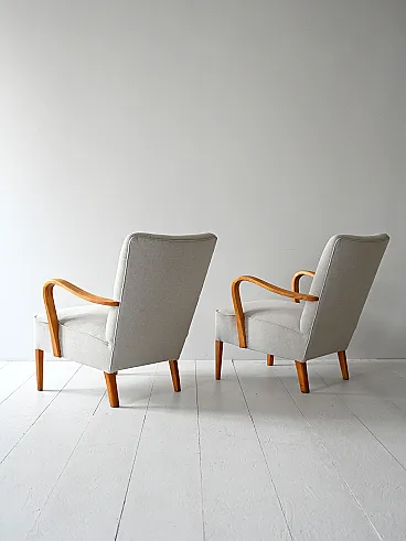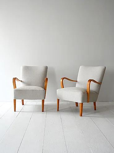 Vintage the teak armchairs with curved armrests, padding and cladding handcrafted in light fabric. Couple of Scandinavian armchairs dating back to the 1950s, with teak structure and carved curved armrests. The light fabric coating and the internal padding were redone by us, respecting the original lines. The balance between soft shape and hot materials tells the sober elegance of the northern design of the mid -century. Good condition. They could present signs of time. Pleasure pay attention to the photographs.