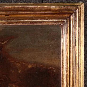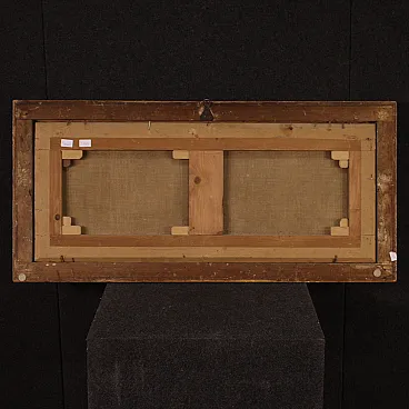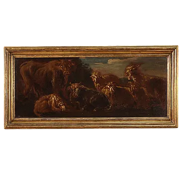 Ancient Italian painting of the second half of the seventeenth century. Oil work on canvas depicting particular subjects to the pasture of good pictorial hand in the style of Rosa da Tivoli. Picture that develops horizontally, of interesting measure and proportion, adorned with an ancient wooden frame, not coeval, carved and golden. It works easily insertable in different points of the house, for antique dealers, furnishings and collectors of gender paintings. Painting characterized by a dark shade that depicts numerous Caproni and a cattle at the top left (see photo). Work that has undergone a conservative restoration intervention, rintelo, replacement of the frame and recovery of color in some points (see photo). Painting belonging to a pendant (see photos and request the price of the couple if available). In good condition. Painted light H 37.5 x L 97.5 cm.