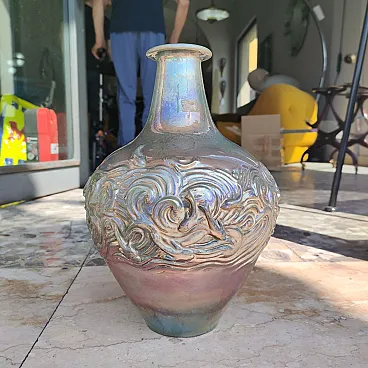 Model and enamelled entirely by hand, the vase has an iridescent luster surface that captures the light by restoring delicate pearly shades of pink, aquamarine, sage green and ancient gold reflections. A rich relief of stylized waves envelops the central part, creating a dynamic play of lights and shadows and giving the object a pleasant tactile depth.