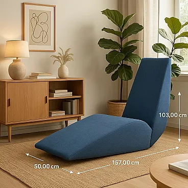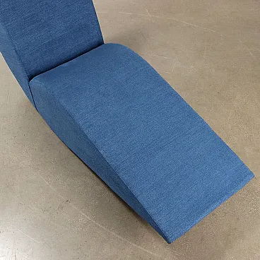 Rocking chair with a sculptural and monolithic shape with a wooden and metal structure, padding in differentiated density foam and recently redone blue fabric covering. In good condition.