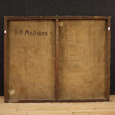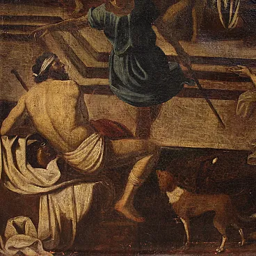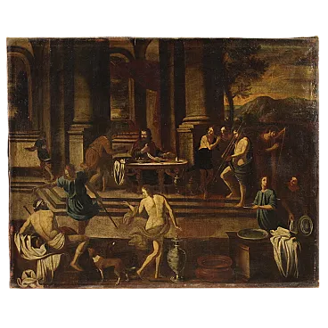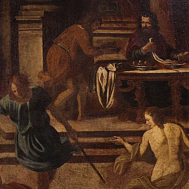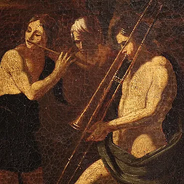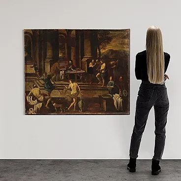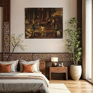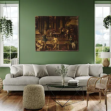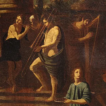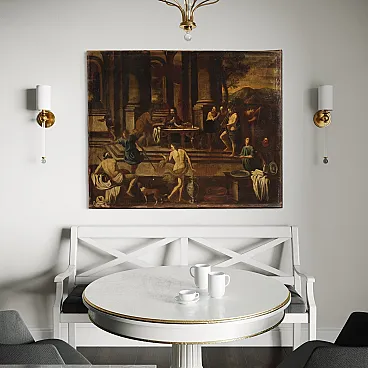 Ancient Italian painting by the mid -seventeenth century. It operates oil on canvas, in the first canvas, depicting a biblical episode of great charm, the Banquet of Herod, of excellent pictorial hand. The scene takes place inside a monumental architecture where we find at the center of the Herod composition and a page that gives him the head of Giovanni Battista. In the foreground we recognize Solomè who dance to obtain the saint's head in prize while all around handguards and splendid musicians accompany the scene. Picture of beautiful extent and pleasant impact, full of characters and details finely made by the wise hands of the painter. Canvas that presents an inscription on the back (see photo). Opera that develops horizontally, ideal for a salon or study, for antique dealers, furnishings and collectors of ancient painting. Painting that has undergone a slight conservative restoration intervention with color recovery in small points, in beautiful patina. It operates overall in good condition.