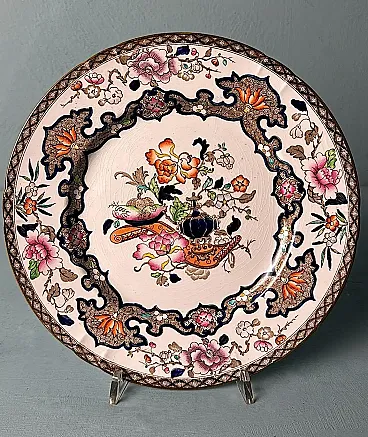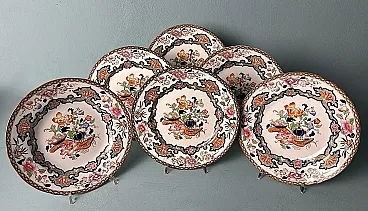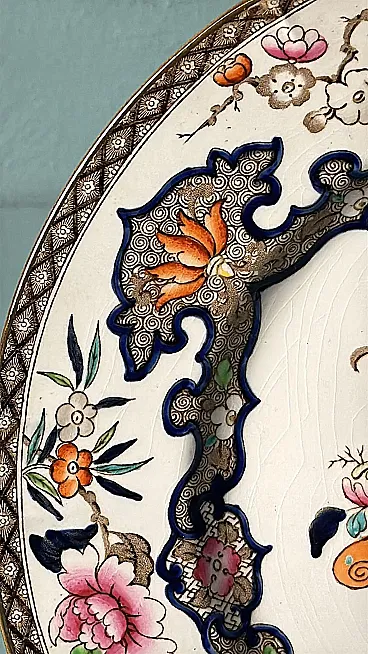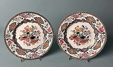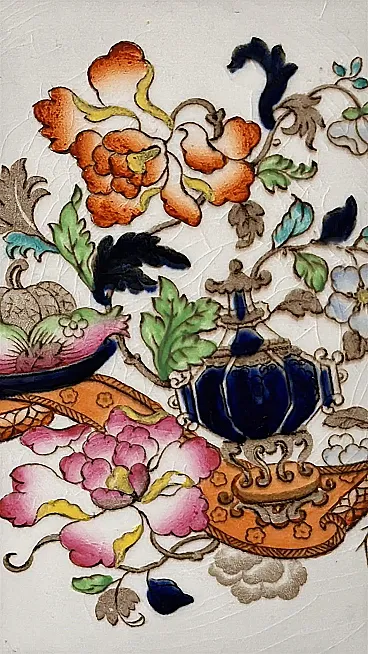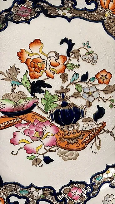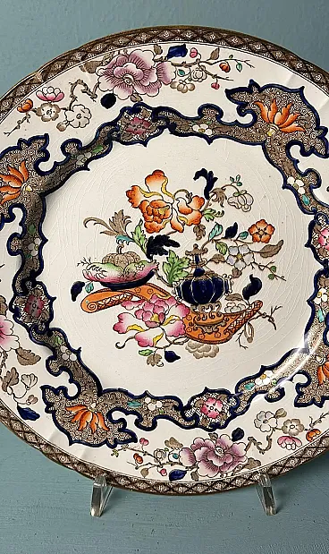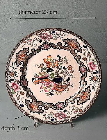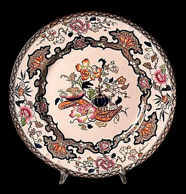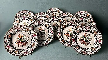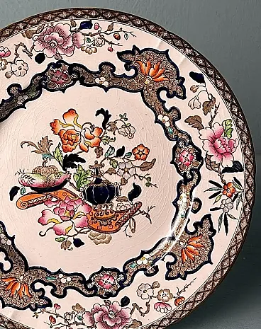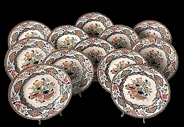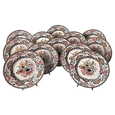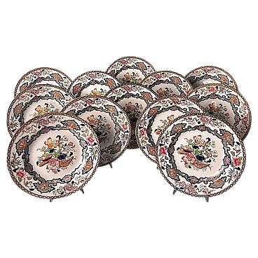 An exceptional set of 12 flat plates (slightly smaller than standard dinner plates), beautifully decorated in a classic chinoiserie style. The entire design was created using the transferware technique, a traditional decorative process developed in Staffordshire, England. The motif was first engraved onto copper plates, then inked and transferred onto a special paper that was applied to the ceramic surface (plates, jugs, trays, tureens, etc.). Once transferred, each plate was hand-painted with remarkable care. The artist skillfully enhanced even the tiniest details, using vibrant, well-balanced colors. The piece was then glazed and kiln-fired. On the back, you'll find the mark of the renowned English manufacturer Minton: a crowned globe framed by laurel, the word "MINTON", the company’s founding date, and “ENGLAND.” Just above the main stamp, a small plow symbol is visible. According to Minton’s date code system used between 1842 and 1942 (see attached photo), this symbol indicates the year of production: 1913. Founded in 1793 by Thomas Minton in Stoke-upon-Trent, Staffordshire – the historic heart of England’s ceramic industry – Minton was, for over a century, a symbol of refinement and innovation. A leader in ceramic artistry and design, the company produced exceptional pieces in bone china (the finest English porcelain: translucent yet durable), earthenware, and majolica, along with dinner services, vases, decorative tiles, and ornamental objects. Minton was also renowned for its glazed architectural tiles, widely used in Victorian public buildings. Notably, during the 19th and early 20th centuries, Minton was among the most sought-after suppliers of custom-made tableware for embassies and heads of state. The plates are in good overall condition. Dimensions: diameter 9.05 in (23 cm) – height 0.78 in (2 cm).