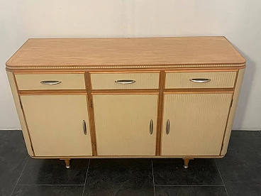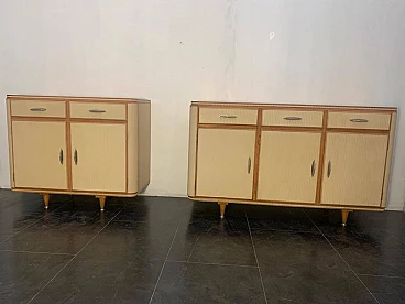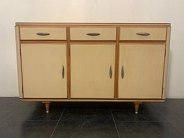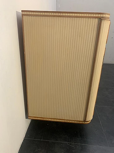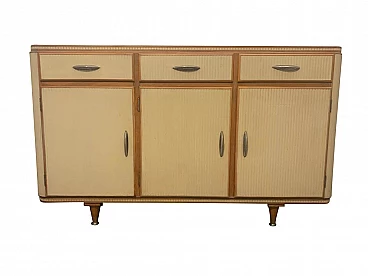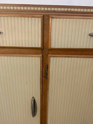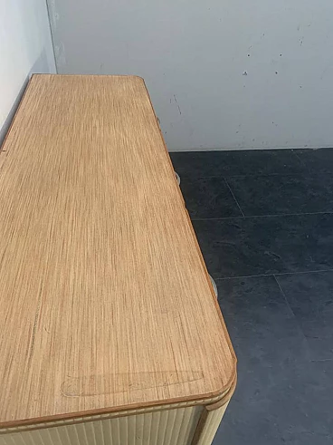 The body, the doors, the front of the drawers are finished in relief with breadstick groove, covered in fabric protected by transparent matt varnish.