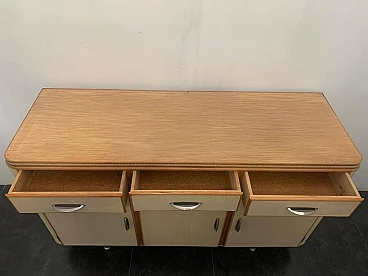 Beechwood construction with honeycomb structure, internally and on the back covered in masonite, on the top in linoleum.