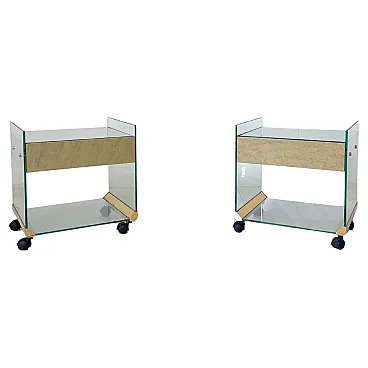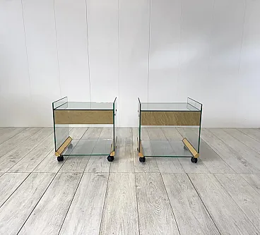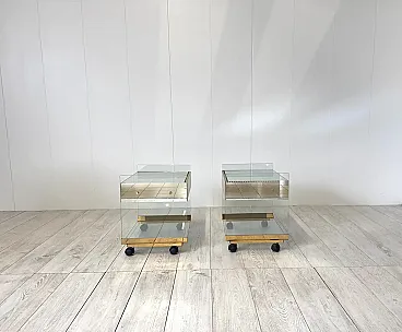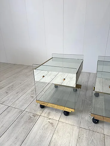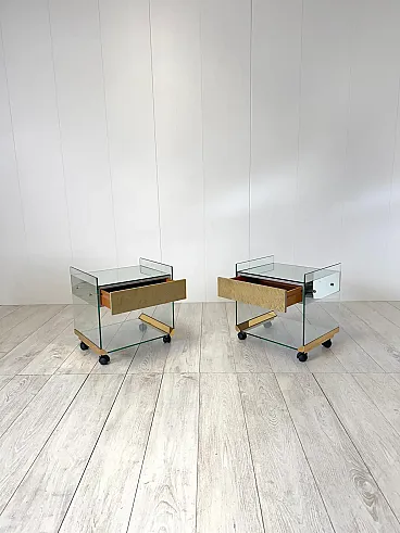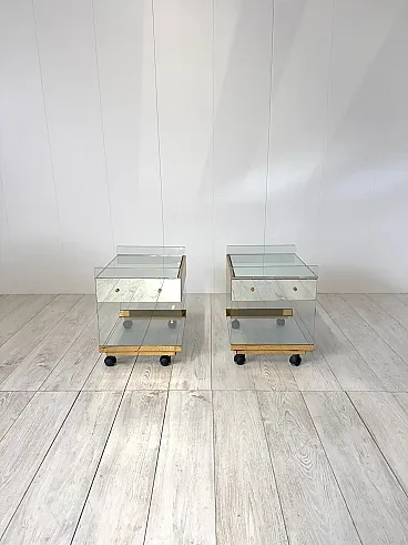 Pair of bedside tables from the 1970s produced by Gallotti & Radice. Glass and mirrored glass frame, brass details. Wooden central drawer. Nightstands are equipped with wheels for easy movement Good vintage condition