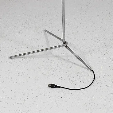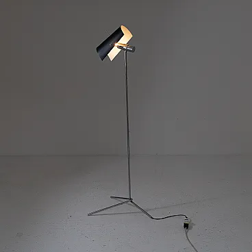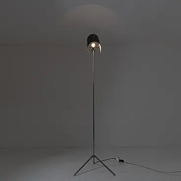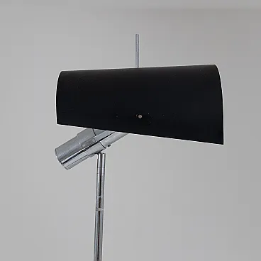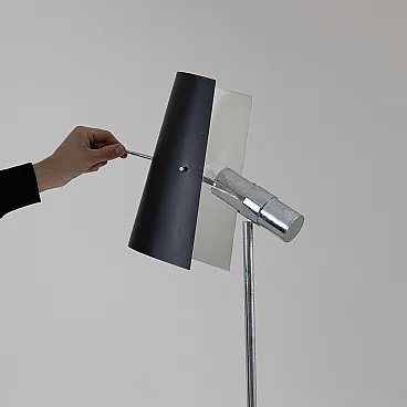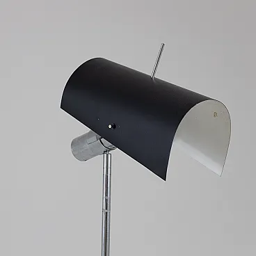 The black painted metal and white metal body is mounted on a chromed tubular structure with three feet base. The curved and adjustable lampshade allows you to orient the light, making it suitable for both domestic and professional contexts.