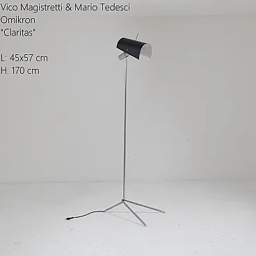 Lamp from the ground with a strong scenic impact designed by Vico Magistretti and Mario Tedeschi for Omikron Italia in the 70s, model "Claritas". A rare example of Italian industrial design, characterized by an essential and rigorous structure, but at the same time extremely expressive.
