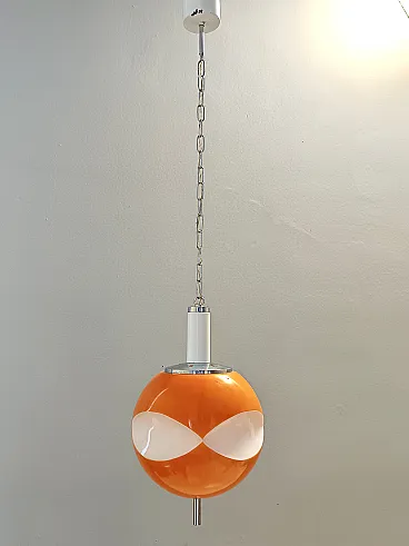 Made in Italy, 1970s. It is made in orange and white opaline glass, chrome and varnished metal. The wiring is compatible with the US. This pendant is a vintage piece, therefore it might show slight traces of use, but it can be considered as in excellent original condition and ready to give ambiance to any room. Its height is easily reducible to 60 cm. Measures: Diameter 25 cm Glass Height 40 cm Total height 105 cm. Order it now! We sell the best quality pieces and we offer an amazing service: if it's not during night time, we answer within 2 hours and we absolutely love to follow every step of the purchase and even after. As matter of fact we really appreciate our customers’ feedback and when we receive pictures of our pieces in their new homes. We assist you during the process and answer all your questions. In addition to this, we always review the pieces before shipping, so that you receive the goods at its very best. We provide the best possible quotes and professionally and carefully pack the items. Insurance is included. And if there is any issue, it is our mission to make so you don't have to worry: we will always be there for you to assist in any way possible.