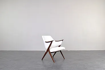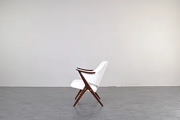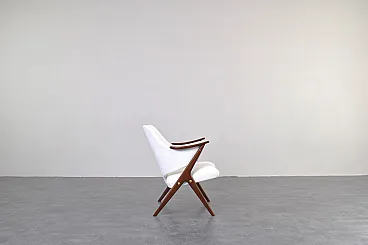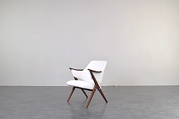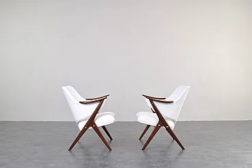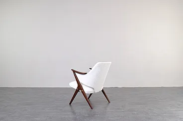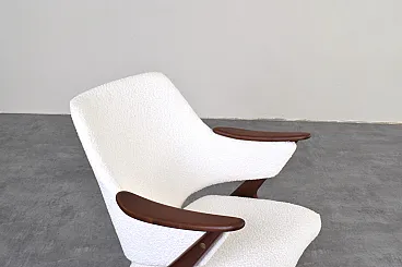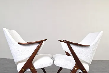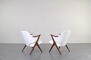This set of two armchairs model Knott was produced in the 1960s in Norway by Brunstad Møbelfabrikk. The wooden elements are made of teak and have been professionally and carefully restored by removing old coatings, staining and finishing with varnish. The seat and backrests are upholstered in new white boucle upholstery. The upholstery sponge was also replaced. There is a minimal difference between the chairs - one of them has two round caps, while the other has hexagonal ones. This is shown in the photos.
