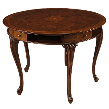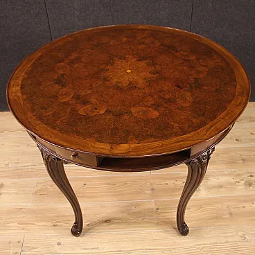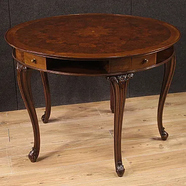 Italian game table of the mid -twentieth century. Excellent quality furniture carved and veneered in walnut, beech, root, mahogany and fruit wood woods. Particular construction table resting on five sculpted legs and chiseled with curl feet (see photo). Wooden plan in good extent and complete service of rounded wooden border see photo). Mobile equipped with five drawers and five open rooms on the side band (see photo). Ideal table to be inserted in a lounge or living room, for antique dealers and furnishings. In good condition with some small sign of wear.