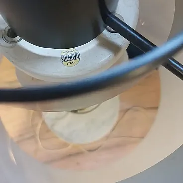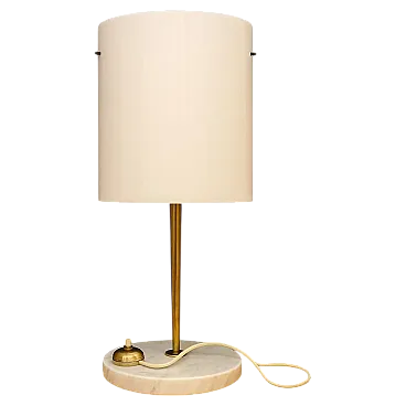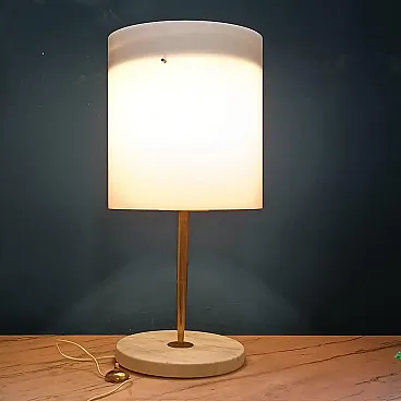Elegant table lamp produced by Stilnovo in the 1950s, a testament to refined mid-century Italian design. This model stands out for its balanced textural composition and purity of form: the round white marble base dialogues harmoniously with the brass stem and cylindrical white opal Plexiglas diffuser. With an overall height of 73 cm and a diameter of 37 cm, the lamp retains its original brass push-button switch, a detail that underscores the authenticity of the piece and its collectible value. The inner structure of the lampshade reveals a sophisticated metal concentric ring support system, typical of Stilnovo's high-quality production. The understated yet sophisticated design makes it ideal for both classic and contemporary settings, perfect as a spotlight on a console, nightstand or study desk. Founded in Milan in 1946 by Bruno Gatta, Stilnovo is one of the most emblematic companies of 20th-century Italian design. Active mainly between the 1950s and 1970s, he collaborated with names such as Achille and Pier Giacomo Castiglioni, Joe Colombo, and Ettore Sottsass, becoming a symbol of technological and formal innovation in lighting. Stilnovo products are distinguished by geometric rigor, experimentation with modern materials, and handcrafted attention to detail. Today his creations are sought after by collectors and featured in the collections of major design museums.