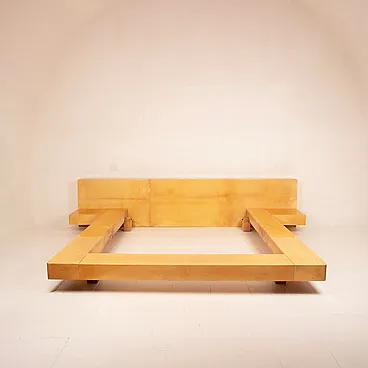 The perimeter structure, solid and geometric, draws a pure and compact rectangle, on which two integrated, suspended bedside tables are grafted, almost invisible in their perfect material continuity. The large flat back, also covered in parchment with meticulously handmade junctions, completes the composition with a sense of rigor and theatricality that recalls monumental architecture.