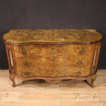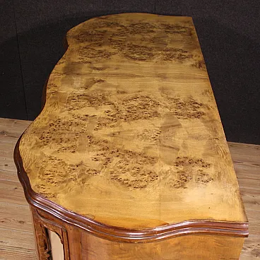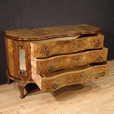 Great Italian drawing of the mid -twentieth century. Moved and bombed mobile, carved in walnut, root and beech with mirrors collected in the side decorations, of excellent quality. Desclio equipped with three large drawers and wooden plane in an excellent size and service character. Poggiante on four carved wooden feet, furniture of good stability. Impressive chamber or salon drawer, with a strong visual impact, for antique dealers and furnishings. Original handles in bronze chiseled metal. Mobile in good condition with some small sign of the time.