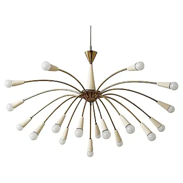 Extraordinary pendant chandelier dating from the 1950s, attributed to the prestigious Italian manufacturer Stilnovo. This iconic piece perfectly embodies the Mid-Century Modern design aesthetic, combining elegance and functionality. The structure is made of polished brass, with eighteen arms branching symmetrically from the central body, each ending in a lamp holder. The design is reminiscent of the "Sputnik" style, very much in vogue at that time, characterized by geometric shapes and clean lines. The chandelier's generous size makes it a central element in any setting. The chandelier has undergone light polishing, while retaining the original patina that testifies to its authenticity and historical value. Excellent vintage condition and original but still working electrical system. u2028Stilnovo, founded in Milan in 1946 by Bruno Gatta, was one of Italy's most influential lighting companies during the postwar period. Working with leading designers such as Gino Sarfatti and Achille Castiglioni, Stilnovo helped define the language of modern Italian design, with creations that combine technological innovation and aesthetic refinement. This chandelier represents not only an element of lighting, but also a piece of Italian design history, ideal for collectors and modernist enthusiasts.
