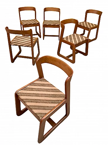Set of 6 chairs from the 1970s designed by Willy Rizzo for Mario Sabot, original, the structure is in Beech, the backrest is in curved plywood, the seat in fabric. The chairs are healthy but need to be revised in the gluing of the assembly and the fabric is to be replaced. For this reason, they are sold as "to be restored".